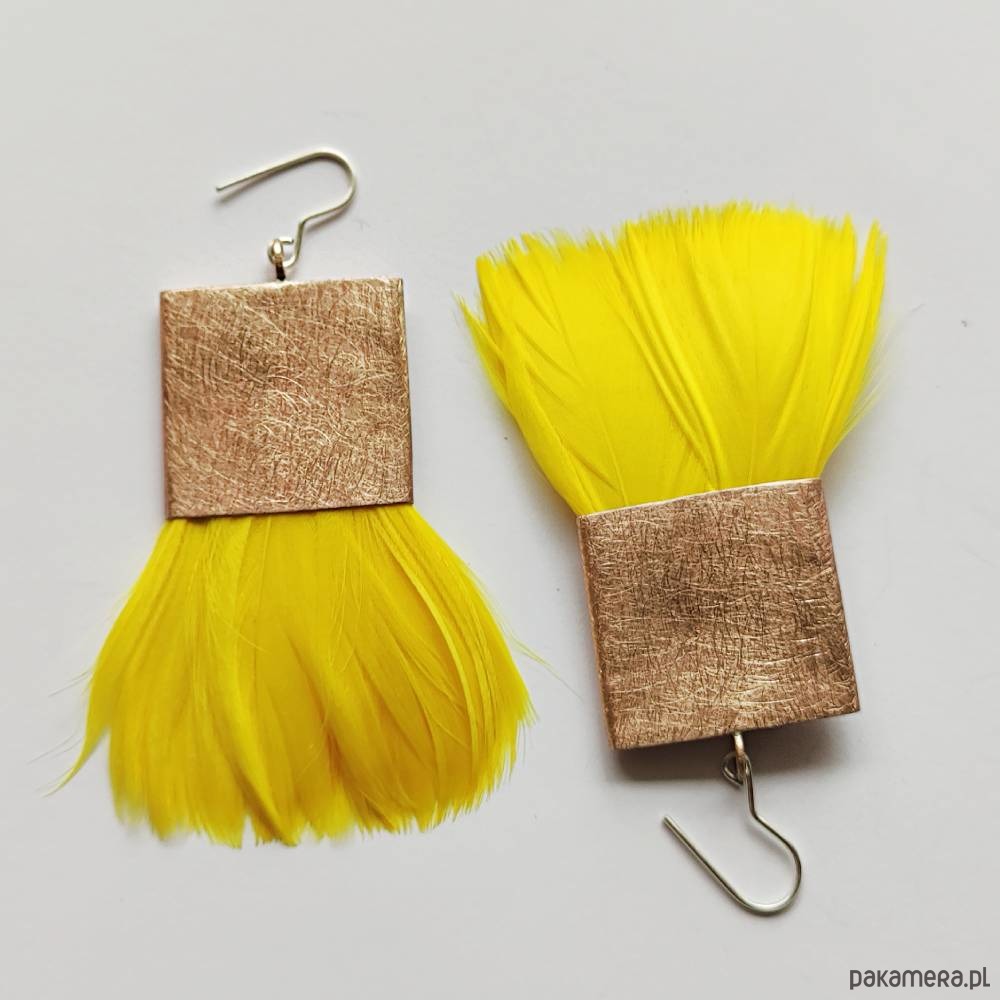 PIÓRKO - stylowy dodatek. Połączenie lekkości piórka i trwałości metalu. Metal niezwykle kontrastuje z naturalnym barwionym puchem. Kolczyki wykonane są z brązu, naturalnie barwione pióra. Brąz - zmatowiony. Bigle otwarte - srebro pr.925. Długość z biglami - 8 cm. Szerokość - 5 cm.