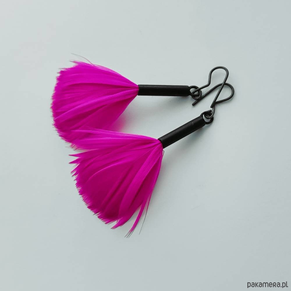 PIÓRKO - stylowy dodatek. Połączenie lekkości piórka i trwałości metalu. Metal niezwykle kontrastuje z naturalnym barwionym puchem. Kolczyki wykonane są z mosiądzu, naturalnie barwione pióra. Mosiądz - zmatowiony, oksydowane. Bigle otwarte - srebro pr.925,oksydowane, Długość z biglami - ok. 5,5 cm. Szerokość - 2 cm. Waga - ok. 2,3 g.