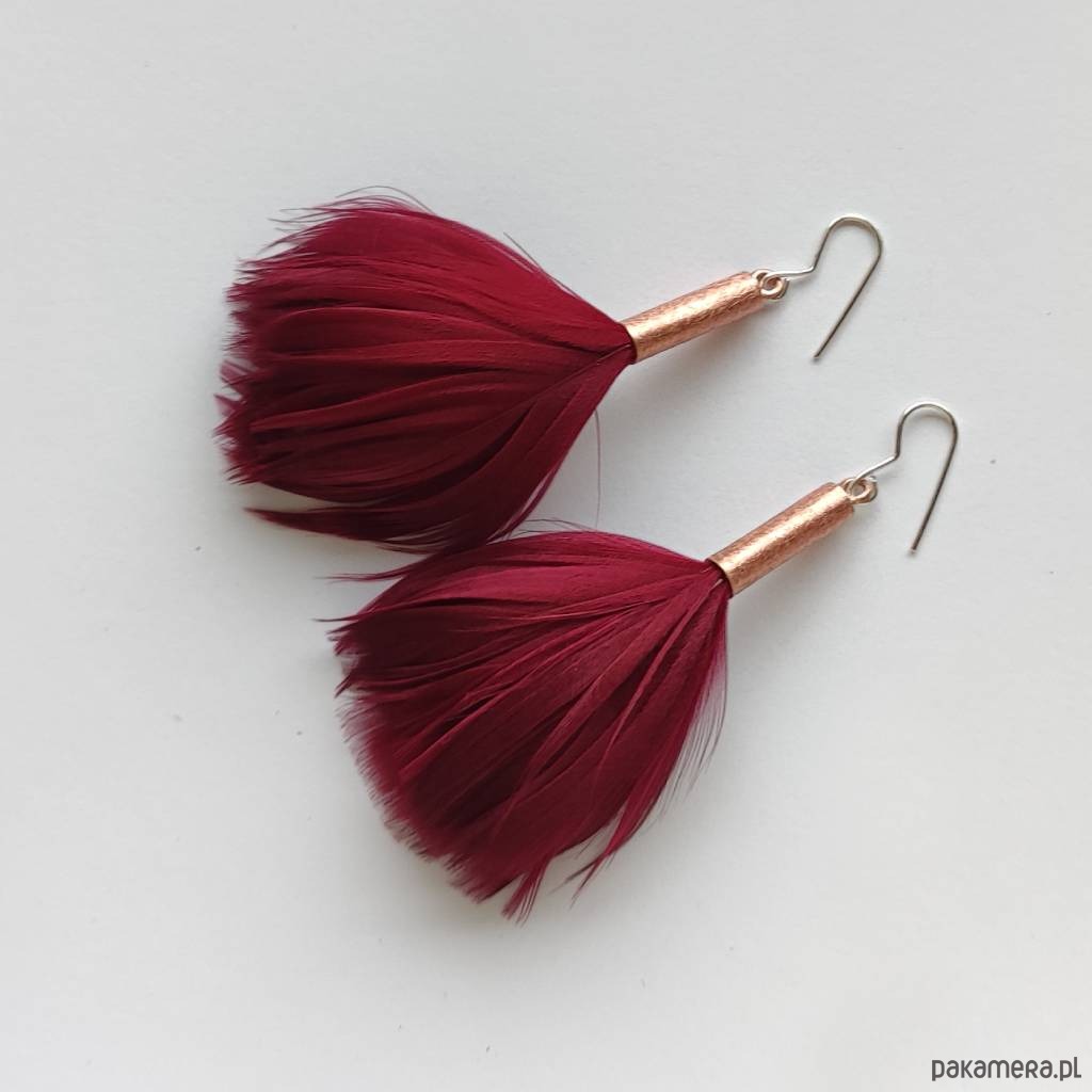 PIÓRKO - stylowy dodatek. Połączenie lekkości piórka i trwałości metalu. Metal niezwykle kontrastuje z naturalnym barwionym puchem. Kolczyki wykonane są z miedzi, naturalnie barwione pióra. Miedź - zmatowiony. Bigle otwarte - srebro pr.925. Długość z biglami - 8,5 cm. Szerokość - 4 cm. Waga - ok. 2,5 g.