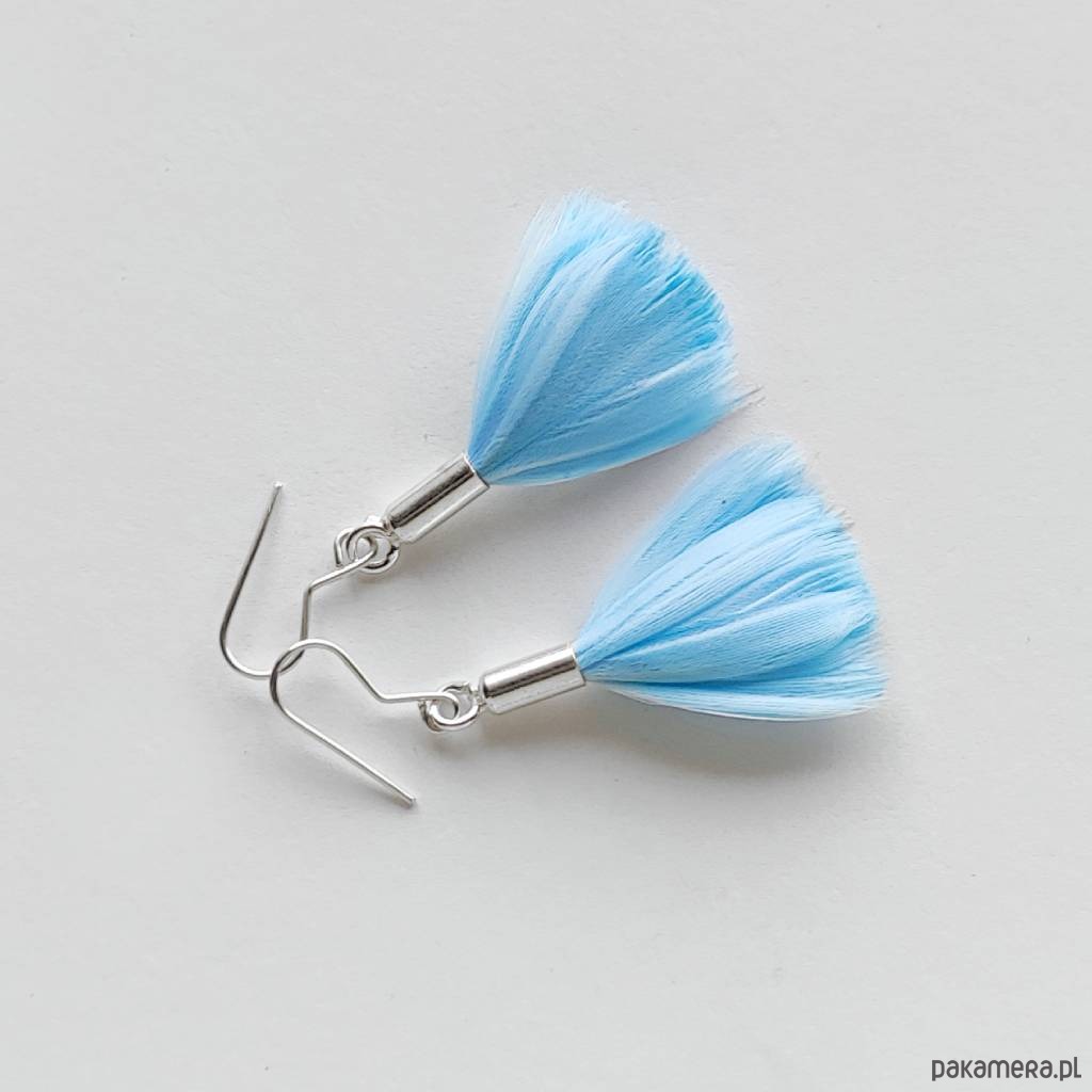 PIÓRKO kolczyki - stylowy dodatek. Połączenie lekkości piórka i trwałości metalu. Metal niezwykle kontrastuje z naturalnym barwionym puchem. Kolczyki wykonane są ręcznie. z srebro, naturalnie barwione pióra. Srebro - wypolerowane. Bigle otwarte - srebro pr.925. Długość z biglami - 4,5 cm.