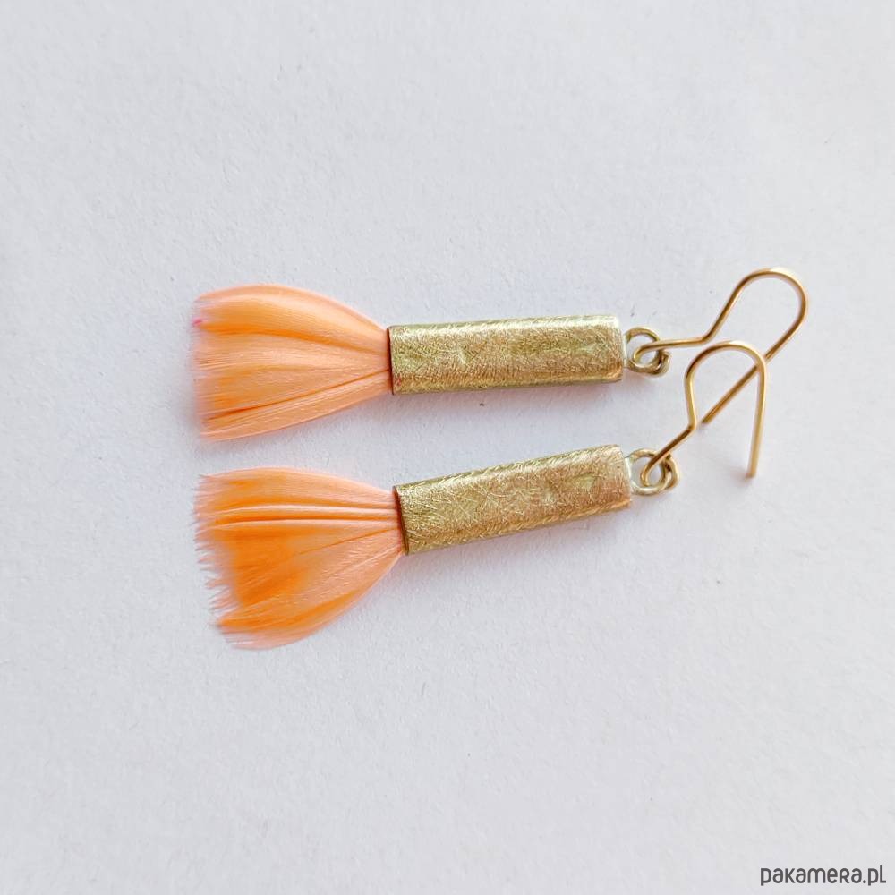 PIÓRKO - stylowy dodatek. Delikatne oraz lekkie kolczyki dodadzą charakteru każdej stylizacji. Metal niezwykle kontrastuje z naturalnym barwionym puchem. Kolczyki wykonane są z miedzi, naturalnie barwione pióra. Miedź - zmatowiony. Bigle otwarte - srebro pr.925. Długość z biglami - 5,5 cm. Szerokość - 1,5 cm. Waga - ok. 2,5 g.