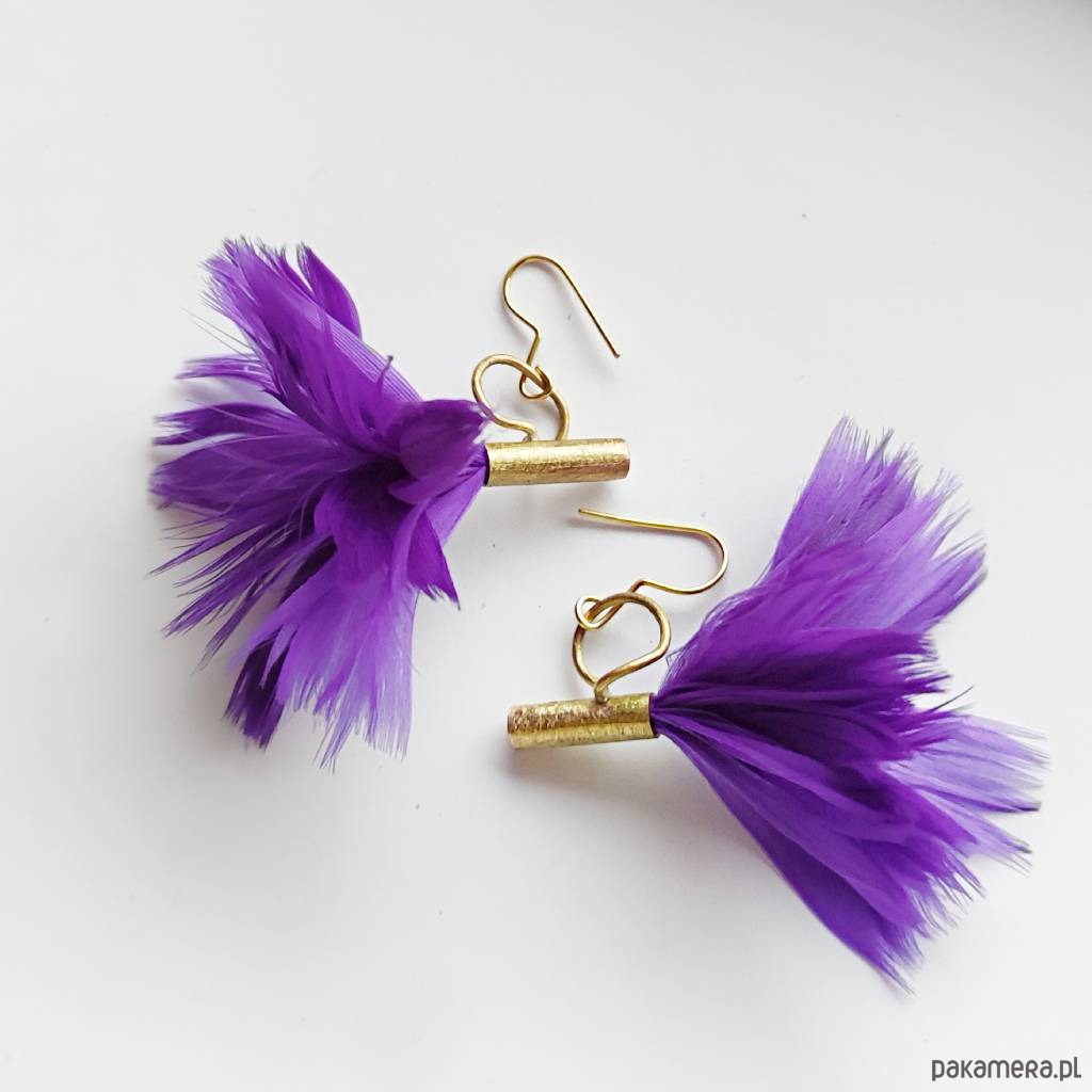 PIÓRKO - stylowy dodatek. Połączenie lekkości piórka i trwałości metalu. Metal niezwykle kontrastuje z naturalnym barwionym puchem. Kolczyki wykonane są z mosiądzu, naturalnie barwione pióra. Mosiądz - zmatowiony. Bigle otwarte - srebro pr.925,pozłacane. Długość z biglami ok. 6 cm. Szerokość - 6cm. .