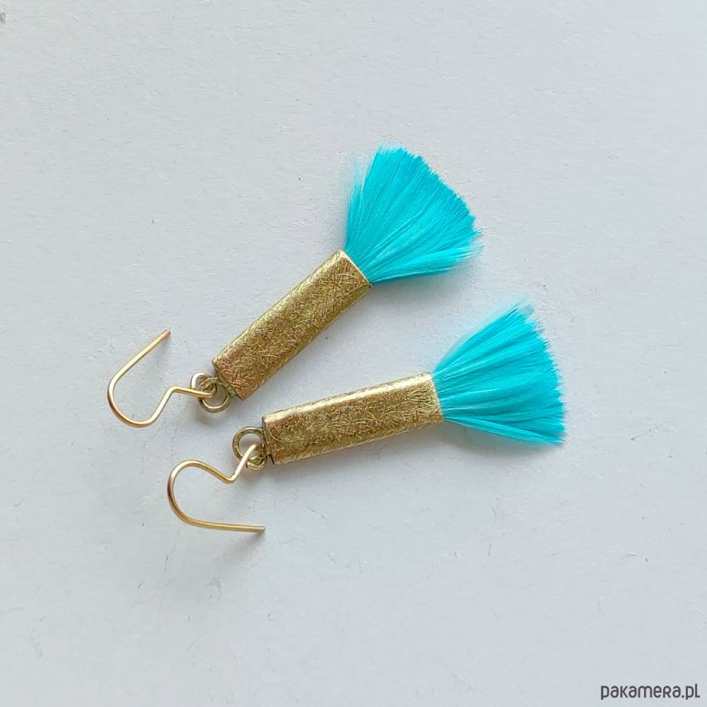 PIÓRKO - stylowy dodatek. Połączenie lekkości piórka i trwałości metalu. Metal niezwykle kontrastuje z naturalnym barwionym puchem. Kolczyki wykonane są z mosiądz, naturalnie barwione pióra. Mosiądz - zmatowiony. Bigle otwarte - srebro pr.925 pozłacane. Długość z biglami - 5 cm.