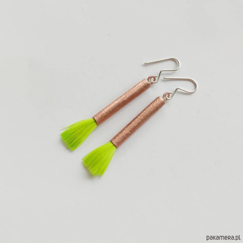 PIÓRKO kolczyki - stylowy dodatek. Połączenie lekkości piórka i trwałości metalu. Metal niezwykle kontrastuje z naturalnym barwionym puchem. Kolczyki wykonane są z miedzi, naturalnie barwione pióra. Miedź - zmatowiony. Bigle otwarte - srebro pr.925. Długość z biglami - 5 cm. Kolczyki bardzo ładnie prezentują się na uszach.