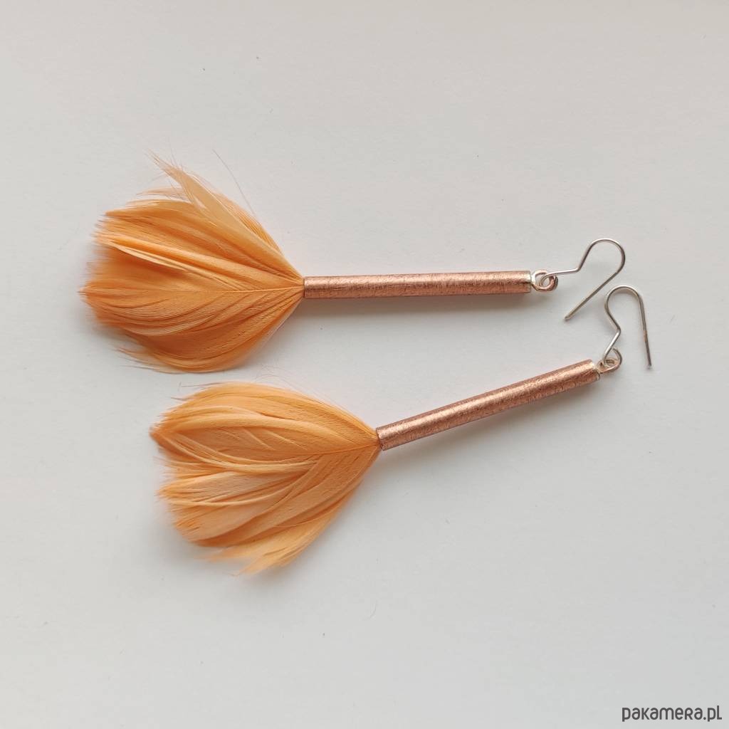 PIÓRKO - stylowy dodatek. Połączenie lekkości piórka i trwałości metalu. Metal niezwykle kontrastuje z naturalnym barwionym puchem. Kolczyki wykonane są z : miedź, naturalne barwione pióra. Miedź : zmatowiona. Bigle otwarte - srebro pr.925. Długość z biglami -8 cm. Bardzo ładnie prezentują się na uszach.