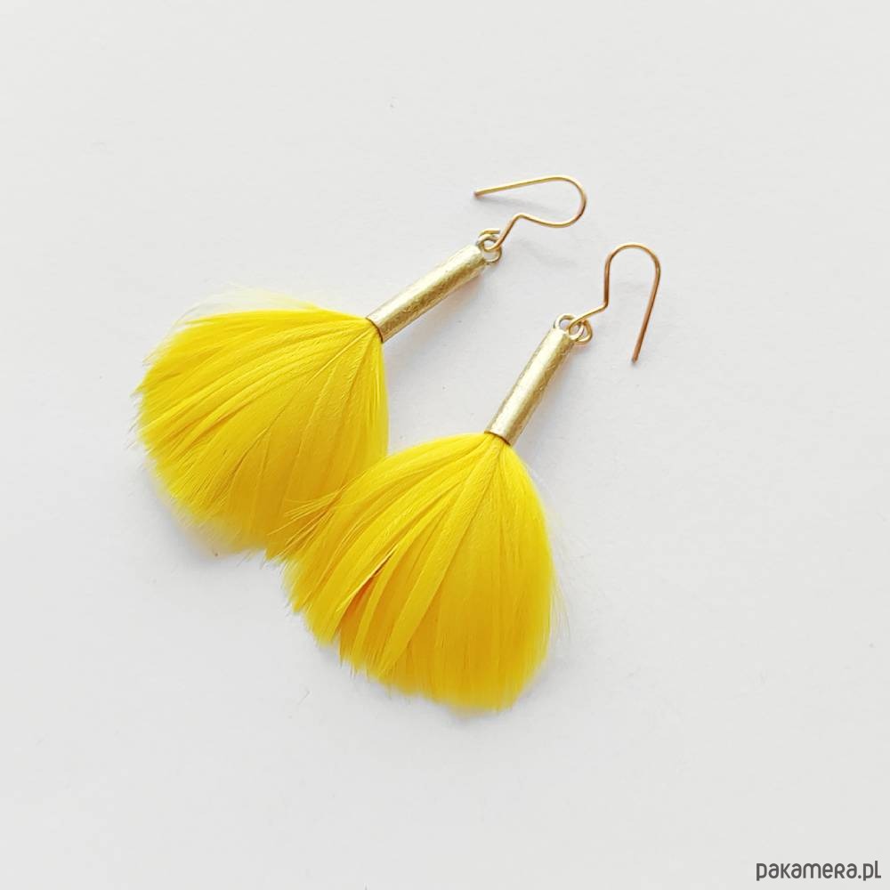 PIÓRKO - stylowy dodatek. Połączenie lekkości piórka i trwałości metalu. Metal niezwykle kontrastuje z naturalnym barwionym puchem. Kolczyki wykonane są z mosiądzu, naturalnie barwione pióra. Mosiądz - zmatowiony. Bigle otwarte - srebro pr.925 pozłacane. Długość z biglami - ok. 5,5 cm. Szerokość - 2 cm. Waga - ok. 2,3 g.