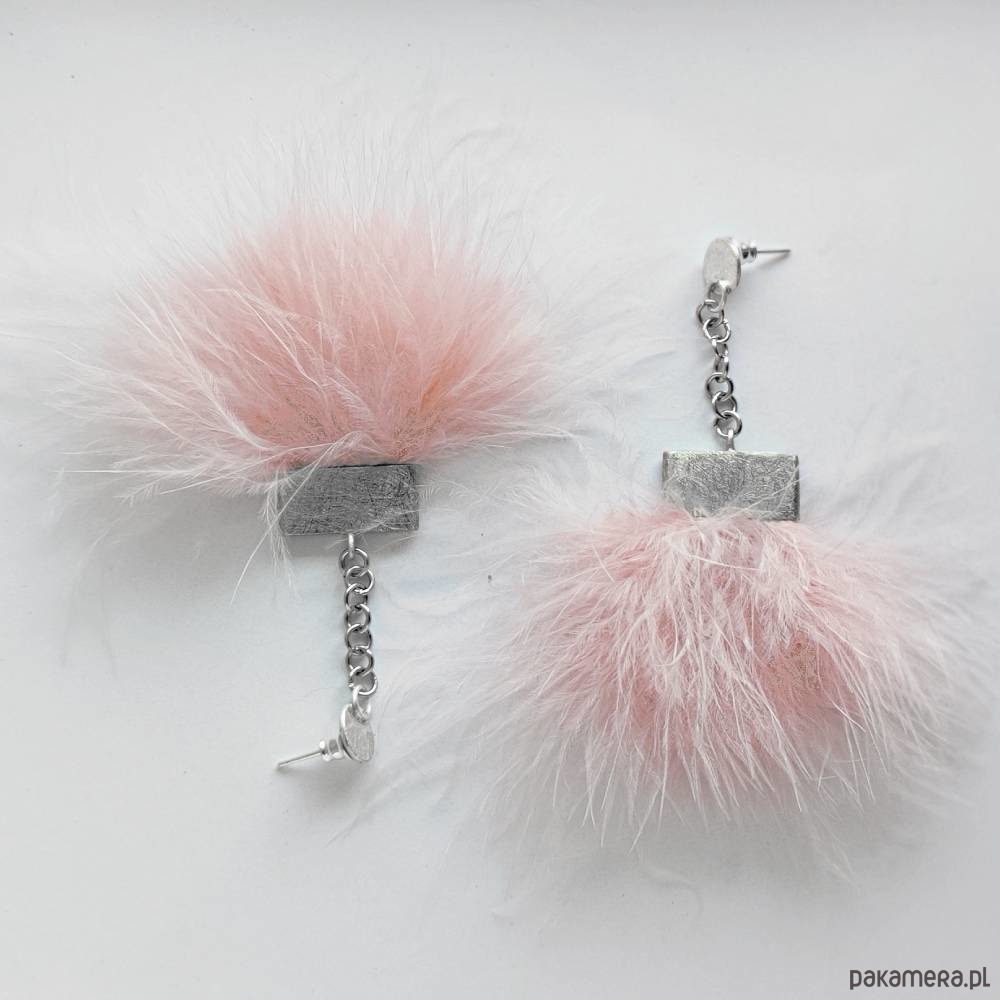 PIÓRKO - stylowy dodatek. Połączenie lekkości piórka i trwałości metalu. Metal niezwykle kontrastuje z naturalnym barwionym puchem. Kolczyki na sztyftach wykonane są z alpaki, srebro ( pr.925), naturalnie barwione pióra. Alpaka - zmatowiona. Długość z ok.9 cm. Szerokość - 5,5 cm.