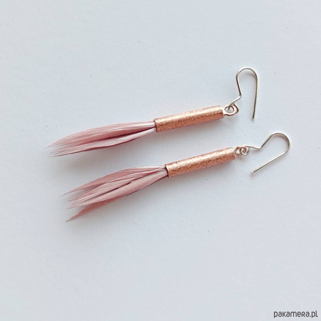 PIÓRKO - stylowy dodatek. Połączenie lekkości piórka i trwałości metalu. Metal niezwykle kontrastuje z naturalnym barwionym puchem. Kolczyki wykonane są z miedzi, naturalnie barwione pióra. Miedź - zmatowiony. Bigle otwarte - srebro pr.925. Długość z biglami - 7,5 cm. Szerokość - 2cm.