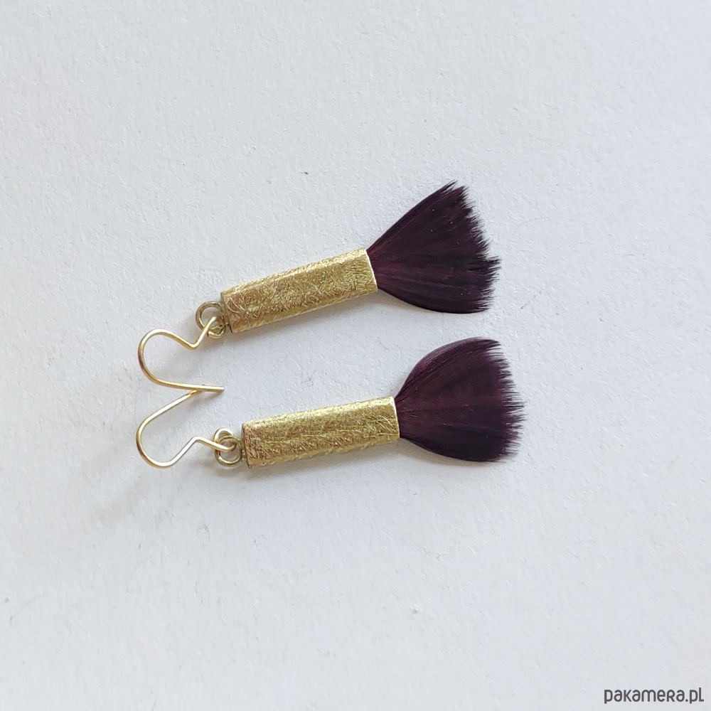PIÓRKO - stylowy dodatek. Połączenie lekkości piórka i trwałości metalu. Metal niezwykle kontrastuje z naturalnym barwionym puchem. Kolczyki wykonane są z miedzi, naturalnie barwione pióra. Miedź - zmatowiony. Bigle otwarte - srebro pr.925. Długość z biglami - 5,5 cm. Szerokość - 1,5 cm. Waga - ok. 2,5 g.