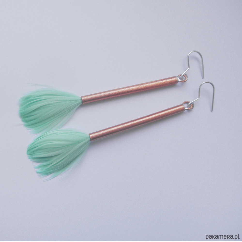 PIÓRKO - stylowy dodatek. Połączenie lekkości piórka i trwałości metalu. Metal niezwykle kontrastuje z naturalnym barwionym puchem. Kolczyki wykonane są z : miedź, naturalne barwione pióra. Miedź : zmatowiona. Bigle otwarte - srebro pr.925. Długość z biglami -11 cm. Kolczyki są bardzo oryginalne.