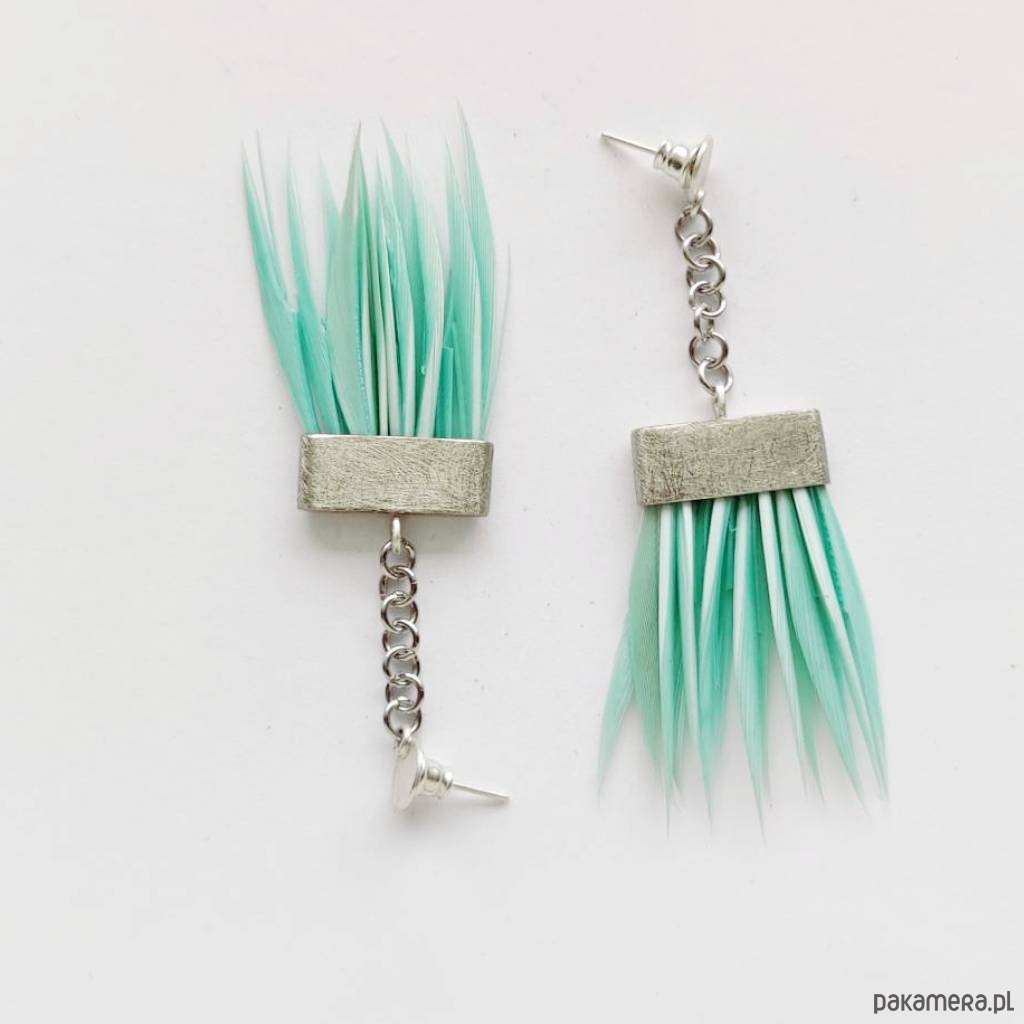 PIÓRKO - stylowy dodatek. Połączenie lekkości piórka i trwałości metalu. Metal niezwykle kontrastuje z naturalnym barwionym puchem. Kolczyki na sztyftach wykonane są z alpaki, srebro ( pr.925), naturalnie barwione pióra. Alpaka - zmatowiona. Długość z ok.9 cm. Szerokość - 5,5 cm.