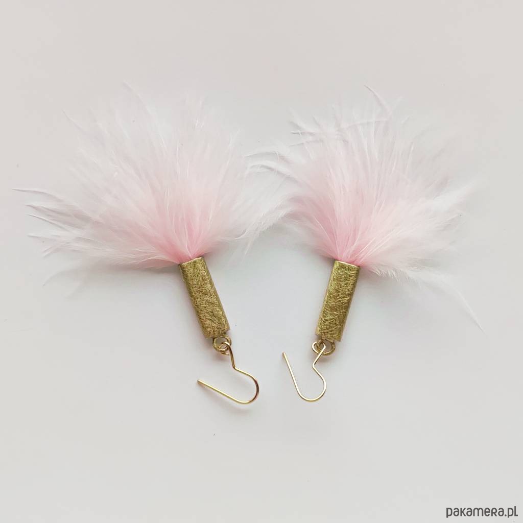 PIÓRKO - stylowy dodatek. Połączenie lekkości piórka i trwałości metalu. Metal niezwykle kontrastuje z naturalnym barwionym puchem. Kolczyki wykonane są z mosiądzu, naturalnie barwione pióra. Mosiądz - zmatowiony. Bigle otwarte - srebro pr.925 pozłacane. Długość z biglami - ok. 5,5 cm. Szerokość - 2 cm. Waga - ok. 2,3 g.