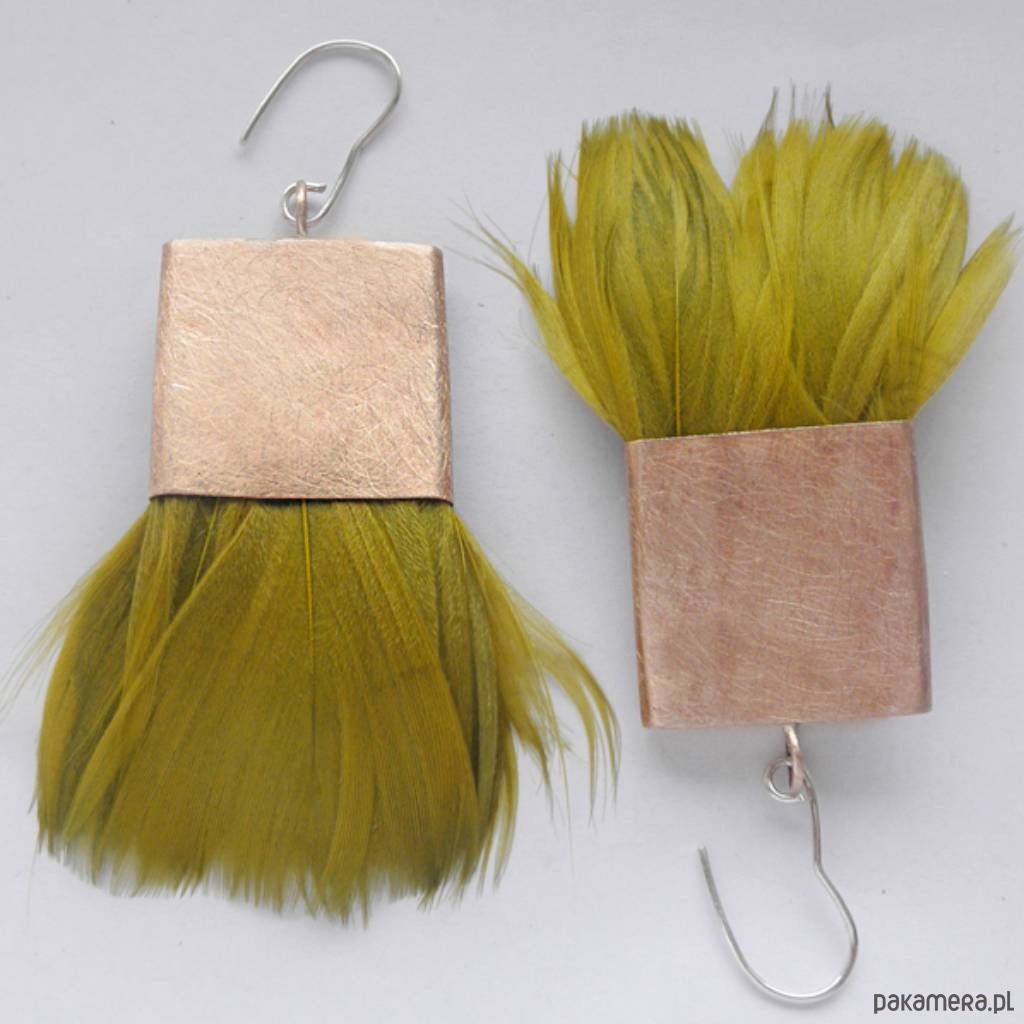 PIÓRKO - stylowy dodatek. Połączenie lekkości piórka i trwałości metalu. Metal niezwykle kontrastuje z naturalnym barwionym puchem. Kolczyki wykonane są z brązu, naturalnie barwione pióra. Brąz - zmatowiony. Bigle otwarte - srebro pr.925. Długość z biglami - 8 cm. Szerokość - 5 cm.
