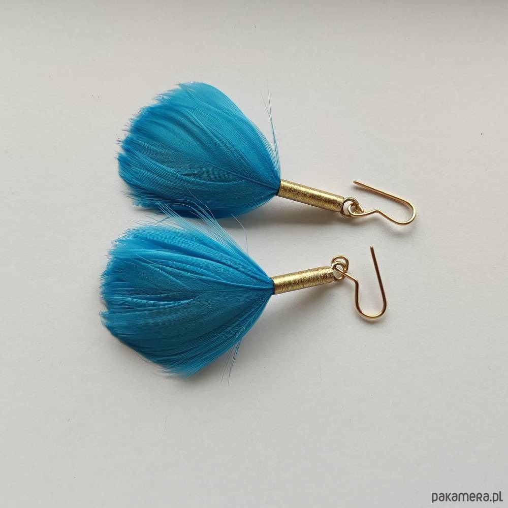 PIÓRKO - stylowy dodatek. Połączenie lekkości piórka i trwałości metalu. Metal niezwykle kontrastuje z naturalnym barwionym puchem. Kolczyki wykonane są z mosiądzu, naturalnie barwione pióra. Mosiądz - zmatowiony. Bigle otwarte - srebro pr.925 pozłacane. Długość z biglami - ok. 5,5 cm. Szerokość - 2 cm. Waga - ok. 2,3 g.
