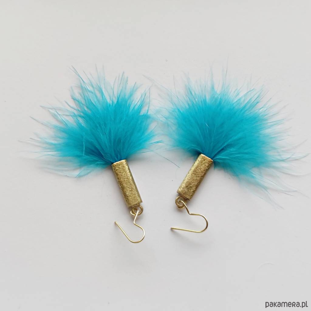 PIÓRKO - stylowy dodatek. Połączenie lekkości piórka i trwałości metalu. Metal niezwykle kontrastuje z naturalnym barwionym puchem. Kolczyki wykonane są z mosiądzu, naturalnie barwione pióra. Mosiądz - zmatowiony. Bigle otwarte - srebro pr.925 pozłacane. Długość z biglami - ok. 5,5 cm. Szerokość - 2 cm. Waga - ok. 2,3 g.