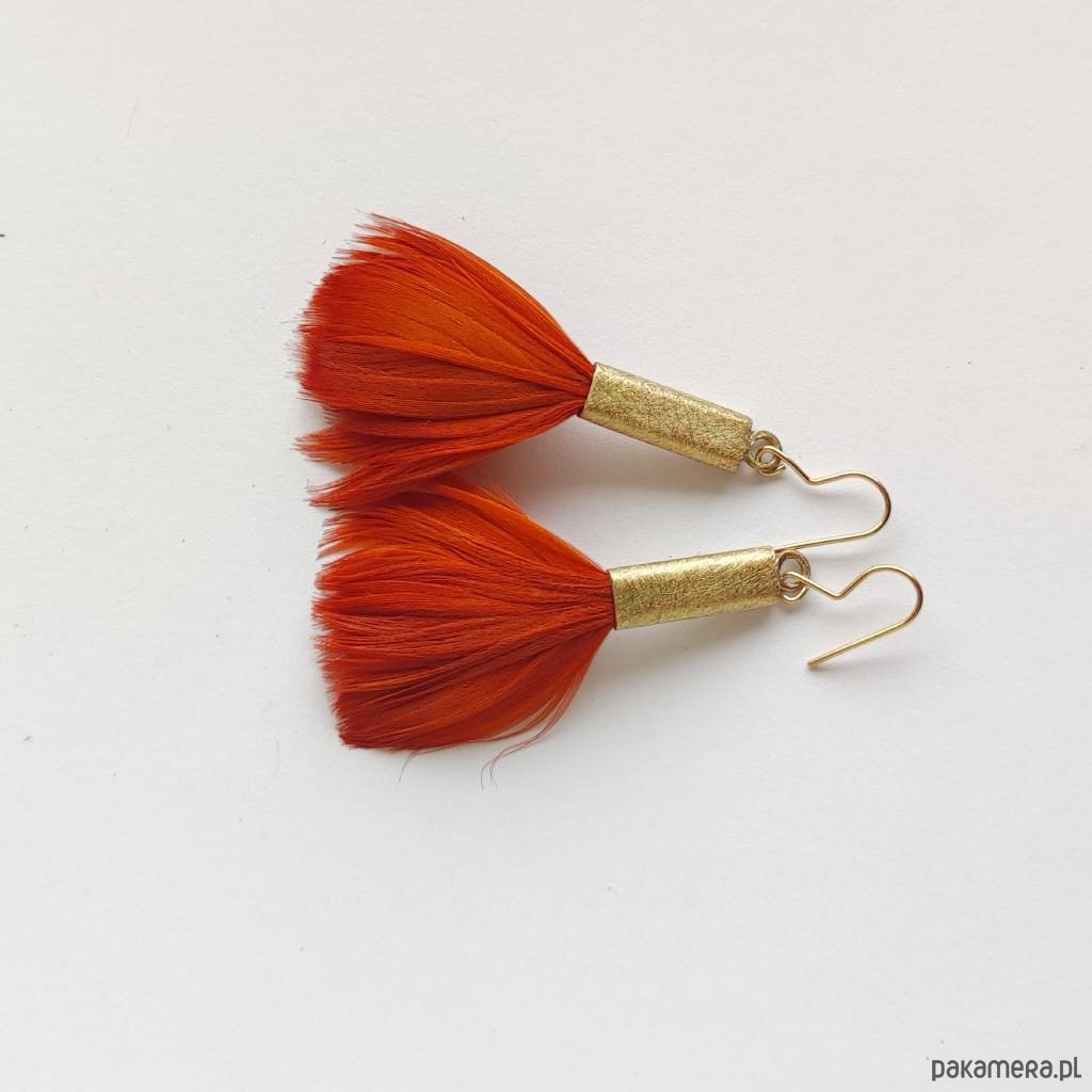 PIÓRKO - stylowy dodatek. Kolczyki przykuwają uwagę. Połączenie lekkości piórka i trwałości metalu. Metal niezwykle kontrastuje z naturalnym barwionym puchem. Kolczyki wykonane są z mosiądz, naturalnie barwione pióra. Mosiądz jest zmatowiony. Bigle otwarte - srebro pr.925 pozłacane. Długość kolczyków z biglami - 7,5 cm. Szerokość - 3 cm. Waga - ok. 2,5 g. Istniej możliwość wykonania kolczyków w innej kolorystyce.