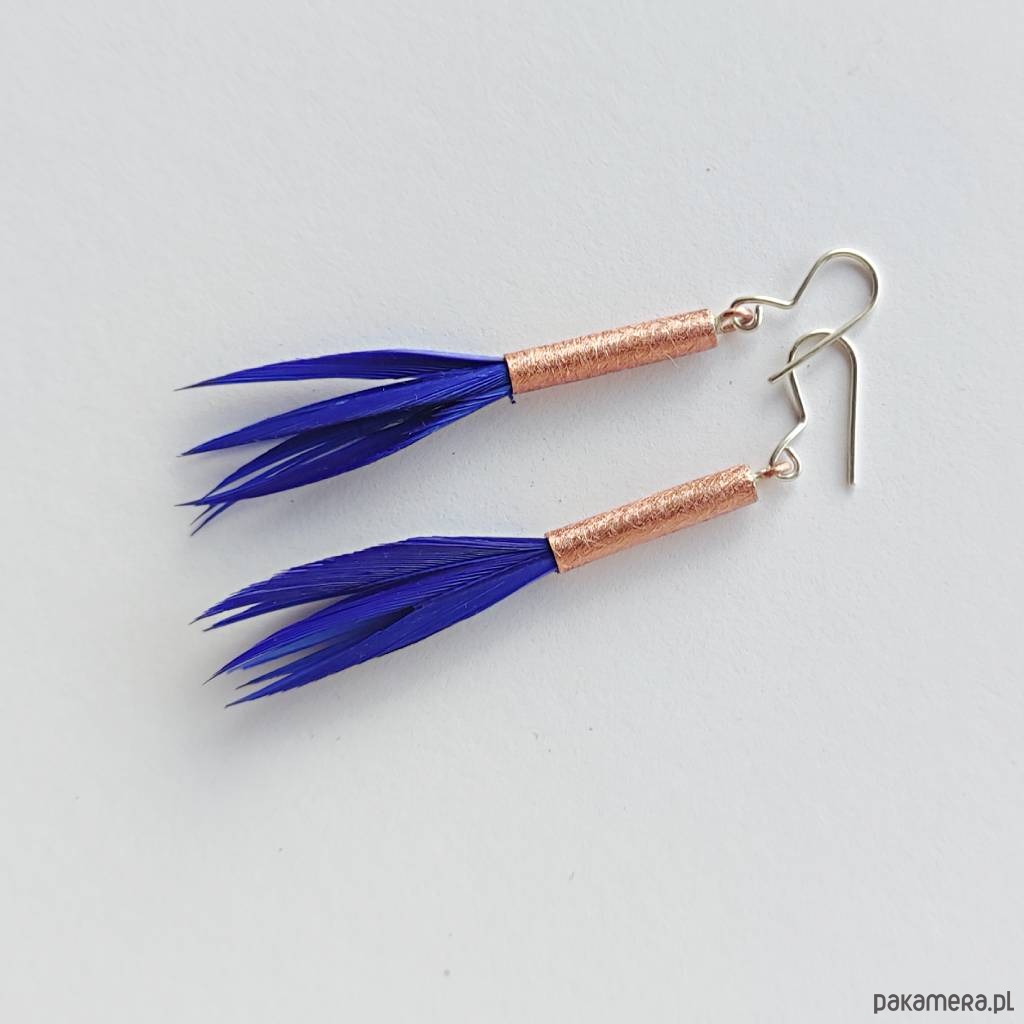 PIÓRKO - stylowy dodatek. Połączenie lekkości piórka i trwałości metalu. Metal niezwykle kontrastuje z naturalnym barwionym puchem. Kolczyki wykonane są z miedzi, naturalnie barwione pióra. Miedź - zmatowiony. Bigle otwarte - srebro pr.925. Długość z biglami - 7,5 cm. Szerokość - 2cm.