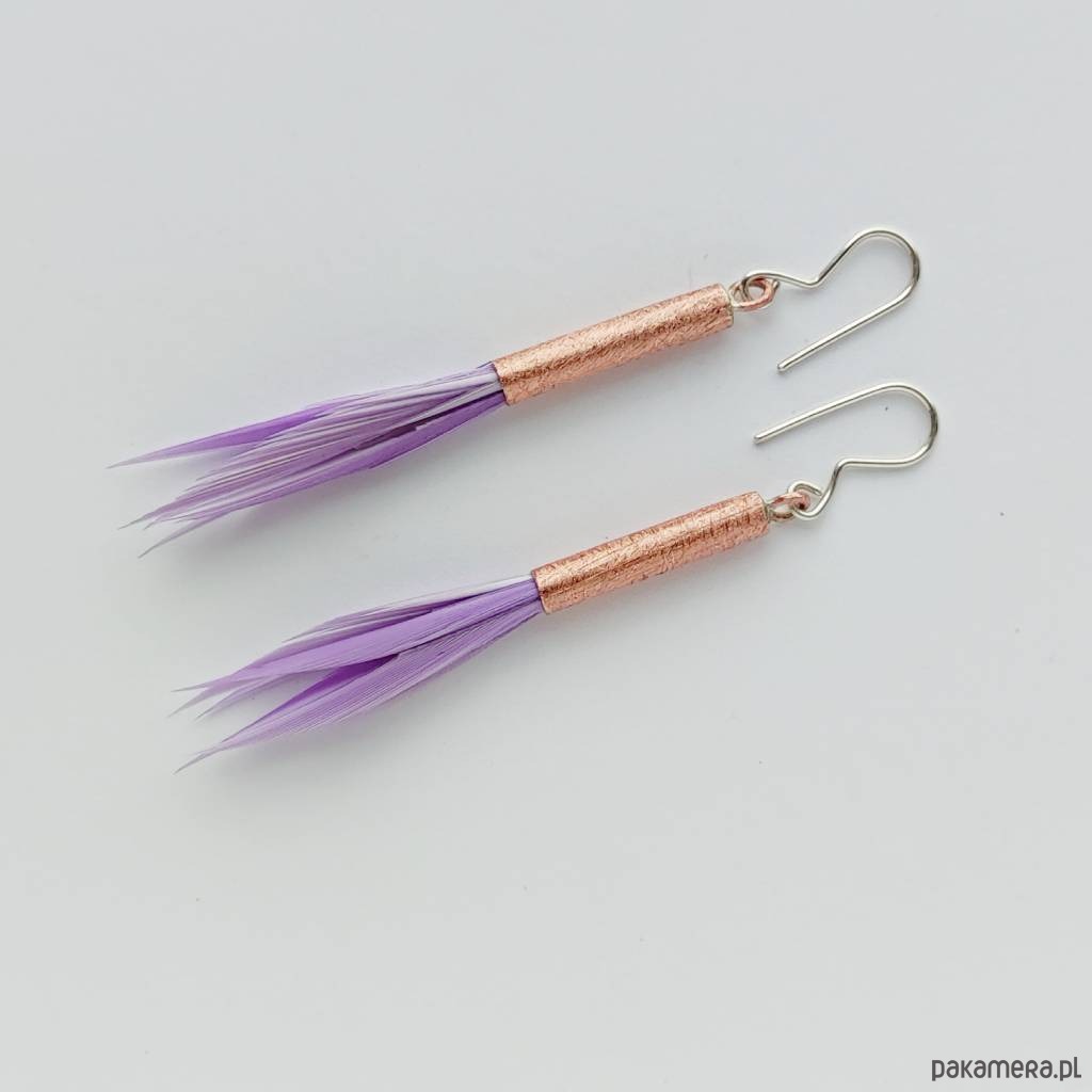 PIÓRKO - stylowy dodatek. Połączenie lekkości piórka i trwałości metalu. Metal niezwykle kontrastuje z naturalnym barwionym puchem. Kolczyki wykonane są z miedzi, naturalnie barwione pióra. Miedź - zmatowiony. Bigle otwarte - srebro pr.925. Długość z biglami - 7,5 cm. Szerokość - 2cm.