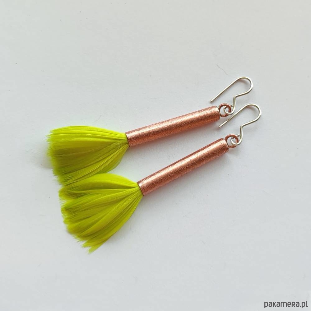 PIÓRKO kolczyki - stylowy dodatek. Połączenie lekkości piórka i trwałości metalu. Metal niezwykle kontrastuje z naturalnym barwionym puchem. Kolczyki wykonane są z miedzi, naturalnie barwione pióra. Miedź - zmatowiony. Bigle otwarte - srebro pr.925. Długość z biglami - 5 cm. Kolczyki są oryginalne.