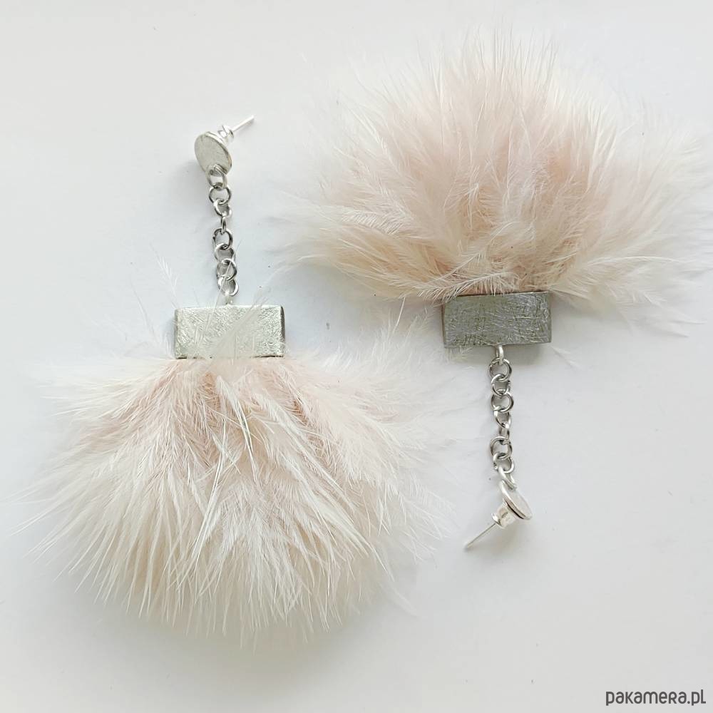 PIÓRKO - stylowy dodatek. Połączenie lekkości piórka i trwałości metalu. Metal niezwykle kontrastuje z naturalnym barwionym puchem. Kolczyki na sztyftach wykonane są z alpaki, srebro ( pr.925), naturalnie barwione pióra. Alpaka - zmatowiona. Długość z ok.9 cm. Szerokość - 5,5 cm.