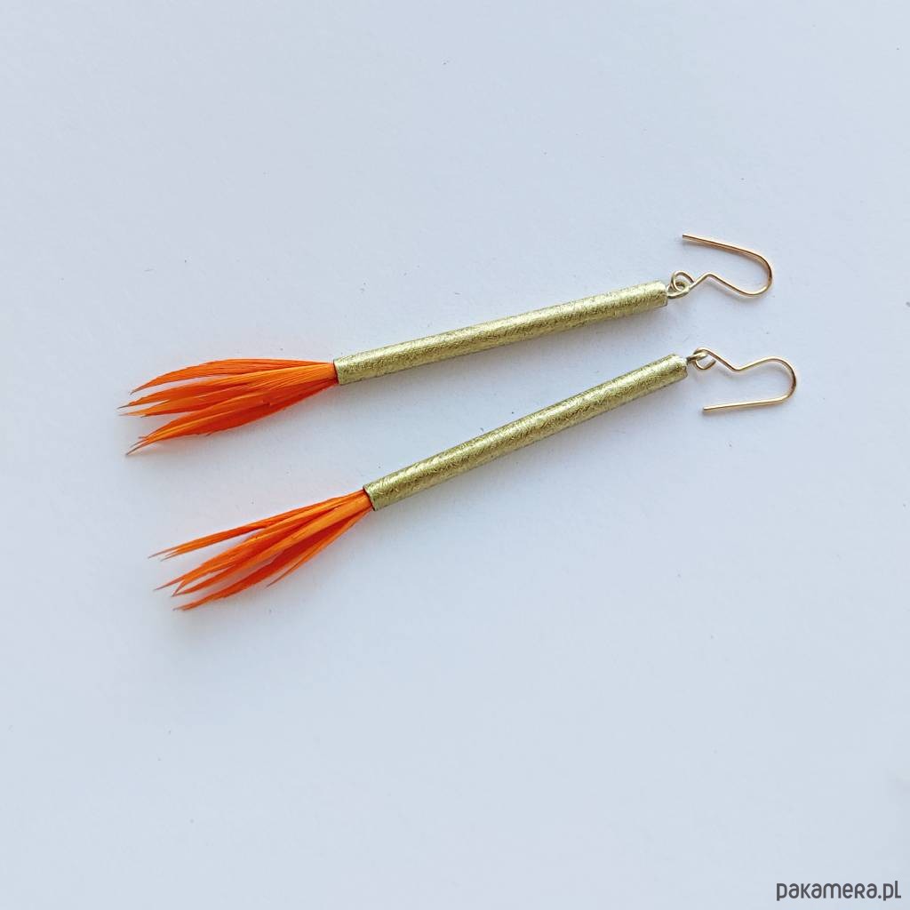 PIÓRKO kolczyki - stylowy dodatek. Połączenie lekkości piórka i trwałości metalu. Metal niezwykle kontrastuje z naturalnym barwionym puchem. Kolczyki wykonane są ręcznie z : mosiądz, naturalne barwione pióra. Mosiądz : zmatowiony. Bigle otwarte - srebro pr.925. Długość z biglami - 9 cm.