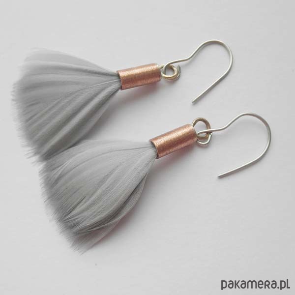 PIÓRKO kolczyki - stylowy dodatek. Połączenie lekkości piórka i trwałości metalu. Metal niezwykle kontrastuje z naturalnym barwionym puchem. Kolczyki wykonane są z : miedź, naturalne barwione pióra. Miedź : zmatowiona. Bigle otwarte - srebro pr.925. Długość z biglami -6,5 cm. Kolczyki są lekkie.