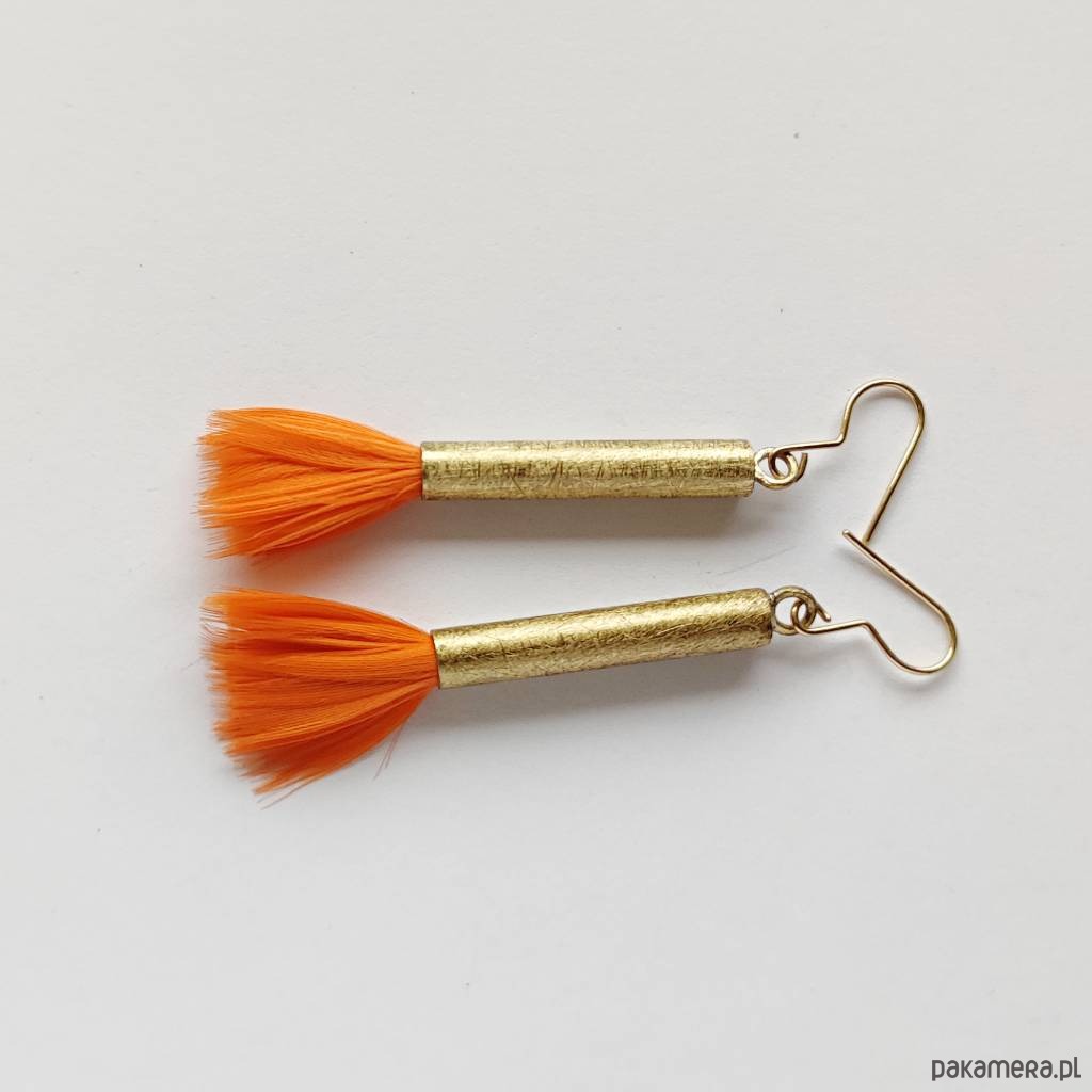 PIÓRKO - stylowy dodatek. Połączenie lekkości piórka i trwałości metalu. Metal niezwykle kontrastuje z naturalnym barwionym puchem. Kolczyki wykonane są z miedzi, naturalnie barwione pióra. Miedź - zmatowiony. Bigle otwarte - srebro pr.925. Długość z biglami - 5 cm. Kolczyki są lekkie.