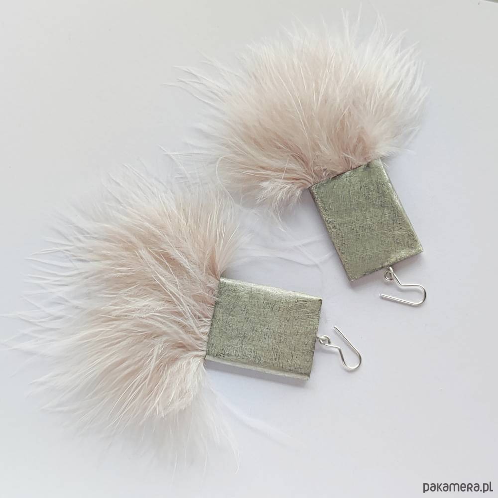 PIÓRKO - stylowy dodatek. Połączenie lekkości piórka i trwałości metalu. Metal niezwykle kontrastuje z naturalnym barwionym puchem. Kolczyki wykonane są z alpaka, naturalnie barwione pióra. Alpaka - zmatowiona. Bigle otwarte - srebro pr.925, . Długość z biglami 11 cm. Szerokość - 7cm.