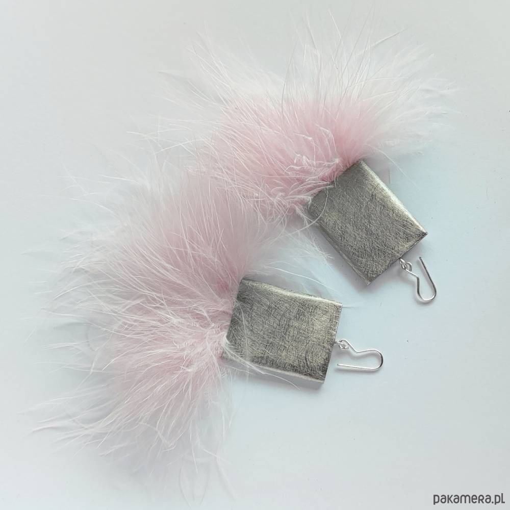 PIÓRKO - stylowy dodatek. Połączenie lekkości piórka i trwałości metalu. Metal niezwykle kontrastuje z naturalnym barwionym puchem. Kolczyki wykonane są z alpaka, naturalnie barwione pióra. Alpaka - zmatowiona. Bigle otwarte - srebro pr.925, . Długość z biglami 11 cm. Szerokość - 7cm.