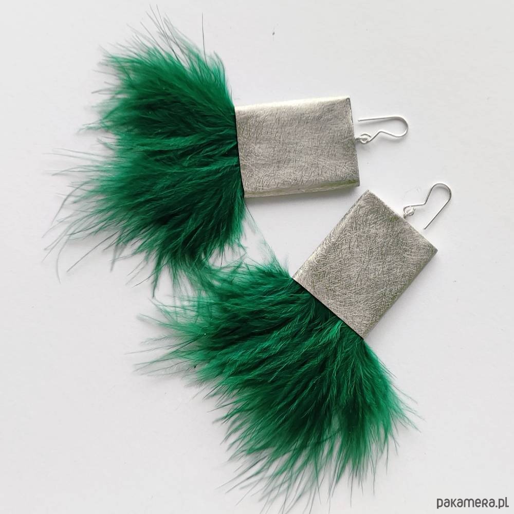 PIÓRKO - stylowy dodatek. Połączenie lekkości piórka i trwałości metalu. Metal niezwykle kontrastuje z naturalnym barwionym puchem. Kolczyki wykonane są z alpaka, naturalnie barwione pióra. Alpaka - zmatowiona. Bigle otwarte - srebro pr.925, . Długość z biglami 11 cm. Szerokość - 7cm.
