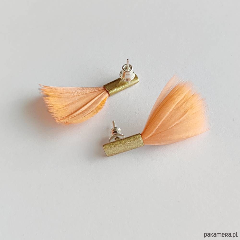 PIÓRKO - stylowy dodatek. Połączenie lekkości piórka i trwałości metalu. Metal niezwykle kontrastuje z naturalnym barwionym puchem.Kolczyki na sztyftach. Kolczyki wykonane są z :mosiądz,srebro- próby 0,925, naturalnie barwione pióra. Mosiądz - zmatowiony. Długość - ok. 3,5cm. Szerokość - 2 cm. Waga - ok. 2 g.