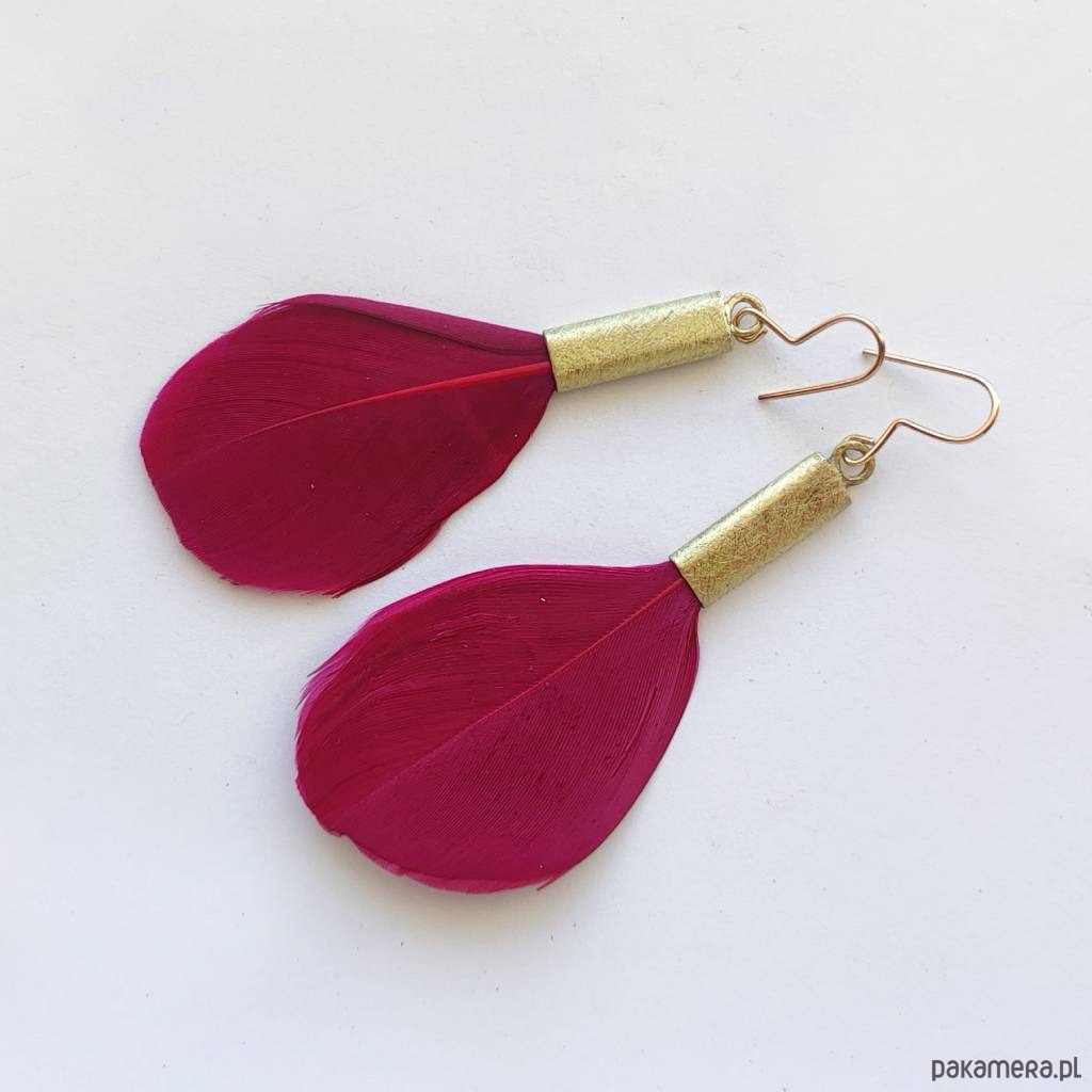 PIÓRKO - stylowy dodatek. Połączenie lekkości piórka i trwałości metalu. Metal niezwykle kontrastuje z naturalnym barwionym puchem. Kolczyki wykonane są z : mosiądz, naturalne barwione pióra. Mosiądz : zmatowiona. Bigle otwarte - srebro pr.925 pozłacane. Długość z biglami - 7 cm. Szerokość ok. 3cm.