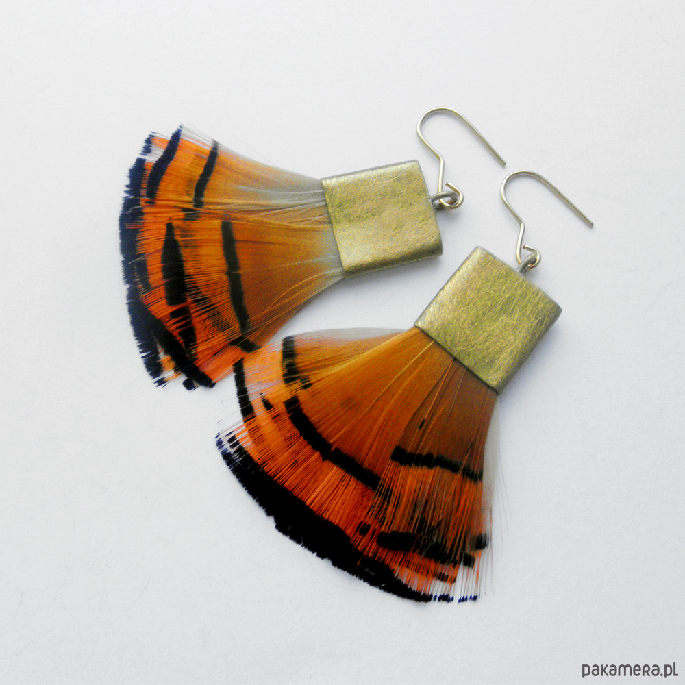PIÓRKO - stylowy dodatek. Połączenie lekkości piórka i trwałości metalu. Metal niezwykle kontrastuje z naturalnym barwionym puchem. Kolczyki wykonane są z mosiądzu, naturalnie barwione pióra. Mosiądz - zmatowiony. Bigle otwarte - srebro pr.925, pozłacane. Długość z biglami -7,5 cm. Szerokość - 3,5 cm.