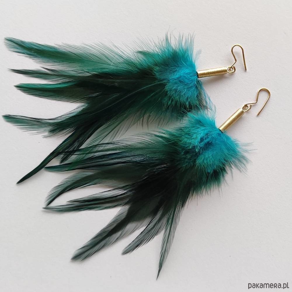 PIÓRKO - stylowy dodatek. Połączenie lekkości piórka i trwałości metalu. Metal niezwykle kontrastuje z naturalnym barwionym puchem. Kolczyki wykonane są z : mosiądz, naturalne barwione pióra. Mosiądz : zmatowiony. Bigle otwarte - srebro pr.925, pozłacane. Długość z biglami - 10cm. Waga: ok. 3 g