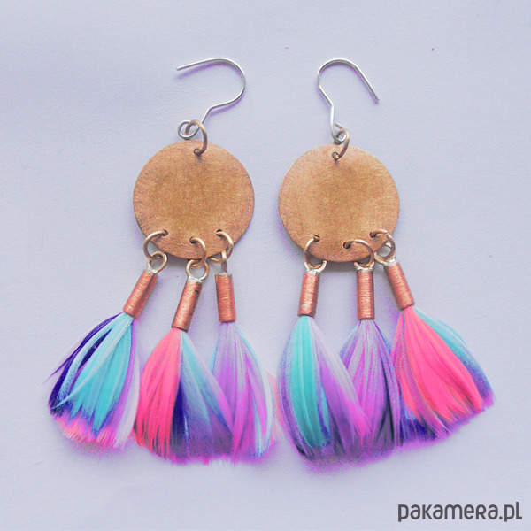 PIÓRKO - stylowy dodatek. Połączenie lekkości piórka i trwałości metalu. Metal niezwykle kontrastuje z naturalnym barwionym puchem. Kolczyki wykonane są z brązu, miedź. naturalnie barwione pióra. Brąz, miedź - zmatowiony. Bigle otwarte - srebro pr.925. Długość z biglami - 10 cm. Szerokość - 5 cm.
