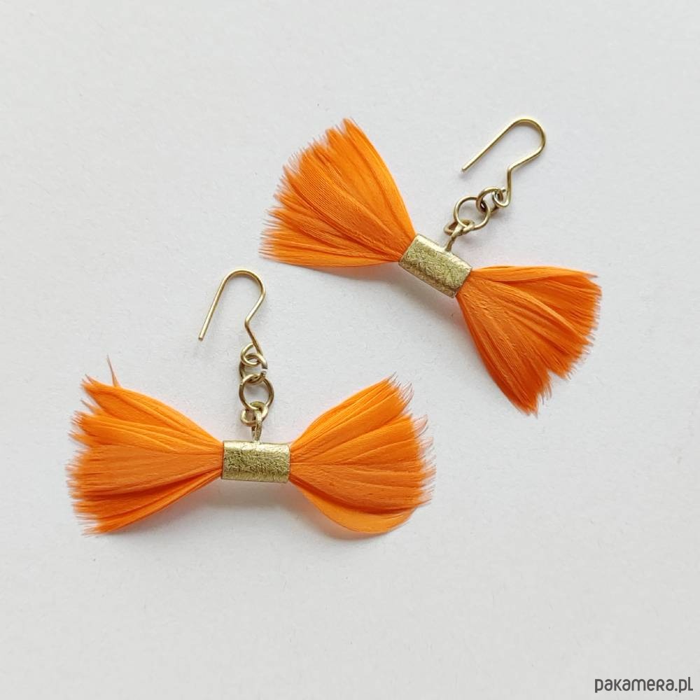 PIÓRKO - stylowy dodatek. Połączenie lekkości piórka i trwałości metalu. Metal niezwykle kontrastuje z naturalnym barwionym puchem. Kolczyki wykonane są z mosiądz, naturalnie barwione pióra. Mosiądz - zmatowiony. Bigle otwarte - srebro pr.925 pozłacane. Długość z biglami - 4,5 cm, szerokość - 5,5 cm