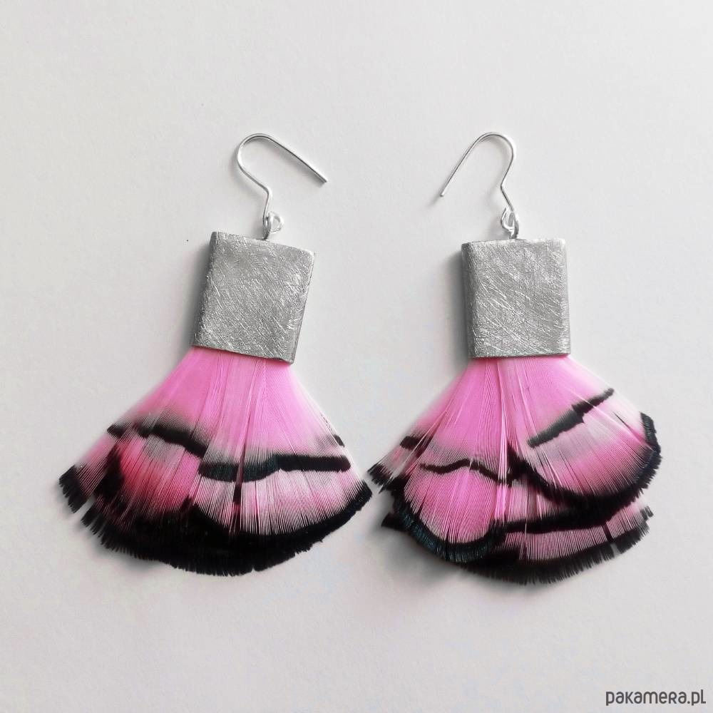 PIÓRKO - stylowy dodatek. Połączenie lekkości piórka i trwałości metalu. Metal niezwykle kontrastuje z naturalnym barwionym puchem. Kolczyki wykonane są z alpaka, naturalnie barwione pióra. Alpaka - zmatowiona. Bigle otwarte - srebro pr.925, . Długość z biglami -7,5 cm. Szerokość - 3,5 cm.