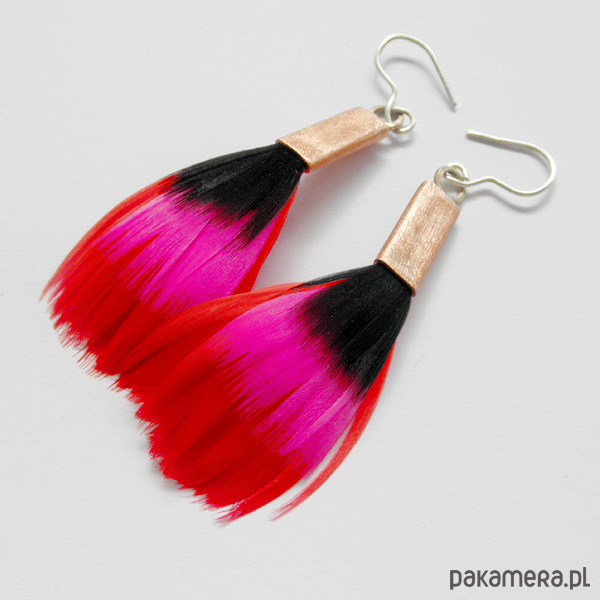 PIÓRKO - stylowy dodatek. Połączenie lekkości piórka i trwałości metalu. Metal niezwykle kontrastuje z naturalnym barwionym puchem. Kolczyki wykonane są z miedzi, naturalnie barwione pióra. Miedź - zmatowiony. Bigle otwarte - srebro pr.925. Długość z biglami - 7,5 cm. Szerokość - 3 cm. Waga - ok. 2,5 g.