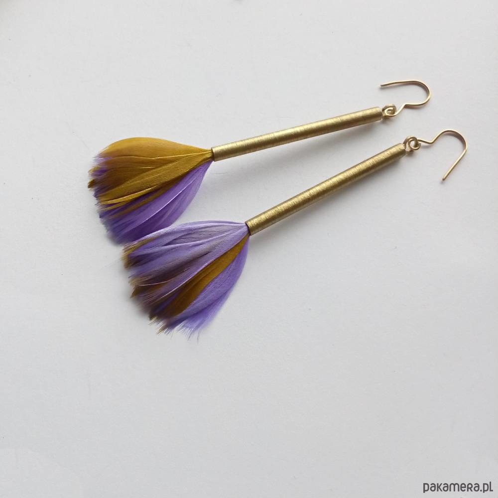 PIÓRKO - stylowy dodatek. Połączenie lekkości piórka i trwałości metalu. Metal niezwykle kontrastuje z naturalnym barwionym puchem. Kolczyki wykonane są z mosiądzu, naturalnie barwione pióra. Mosiądz - zmatowiony. Bigle otwarte - srebro pr.925, pozłacane. Długość z biglami - ok. 10 cm. Szerokość - 2 cm.