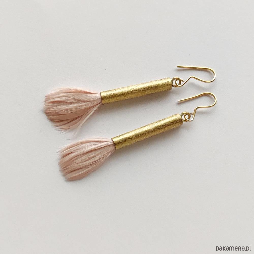 PIÓRKO kolczyki - stylowy dodatek. Połączenie lekkości piórka i trwałości metalu. Metal niezwykle kontrastuje z naturalnym barwionym puchem. Kolczyki wykonane są z mosiądz, naturalnie barwione pióra. Mosiądz - zmatowiony. Bigle otwarte - srebro pr.925 pozłacane. Długość z biglami - 5 cm.