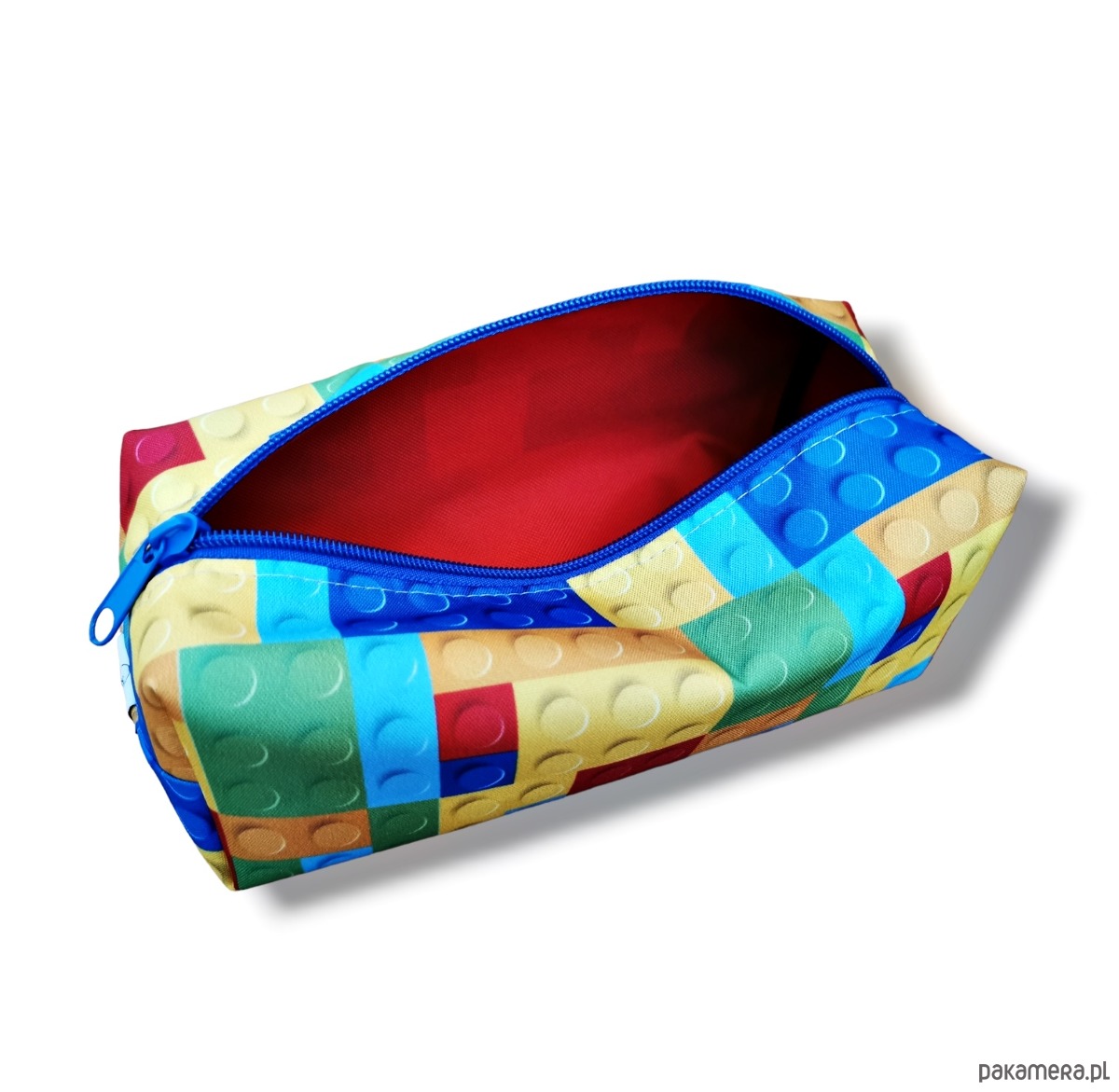 Piórnik uszyty z wodoodpornego materiału z wzorem lego i wodoodporną podszewką