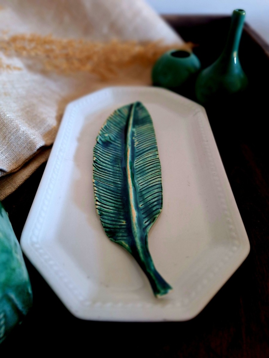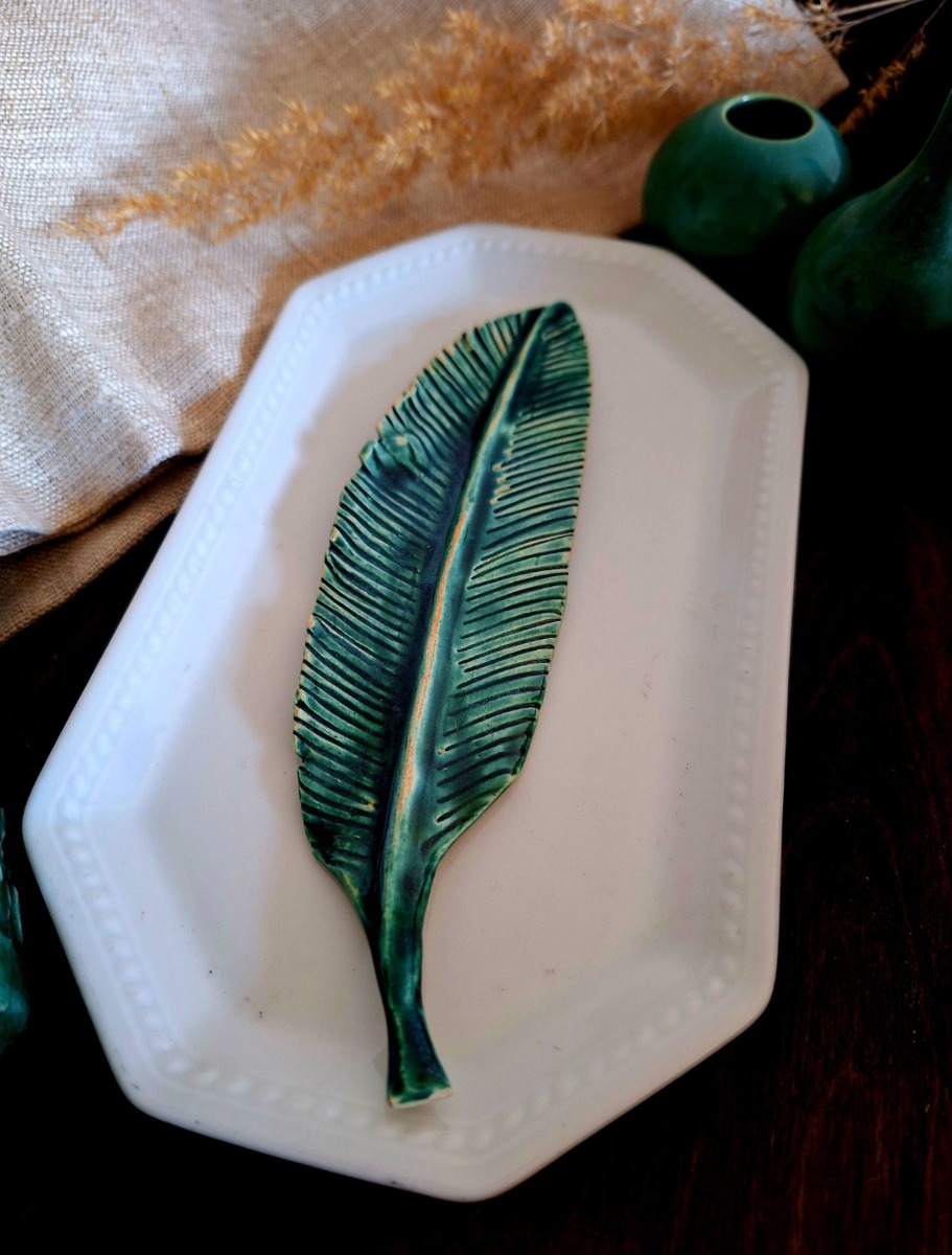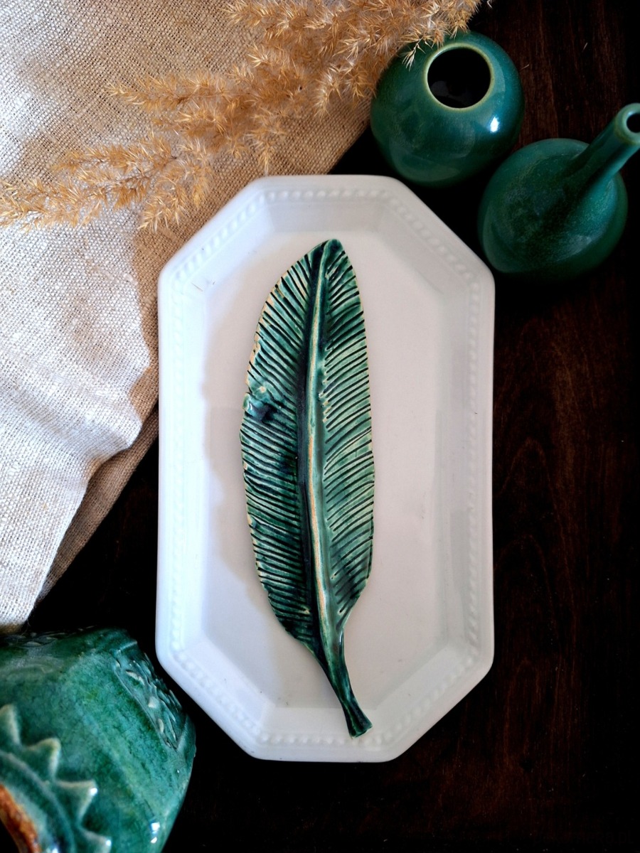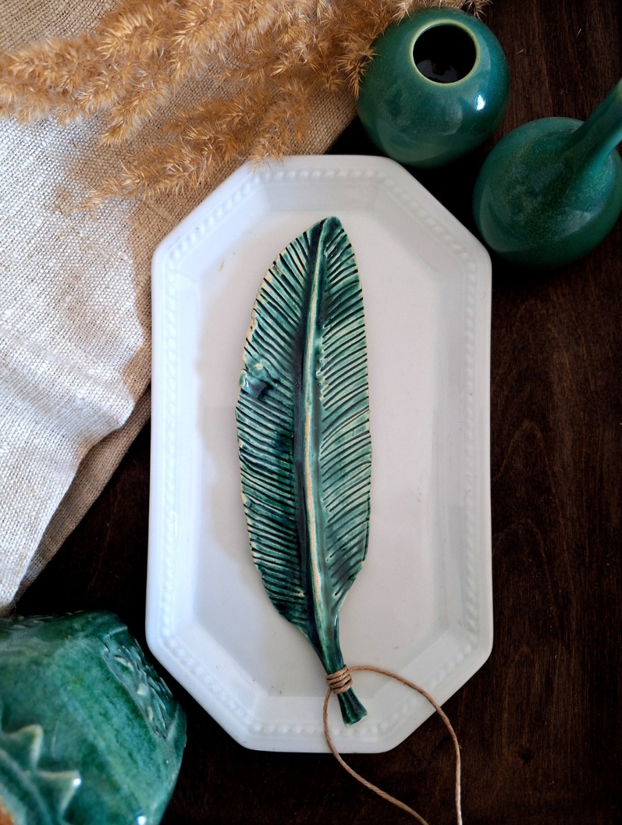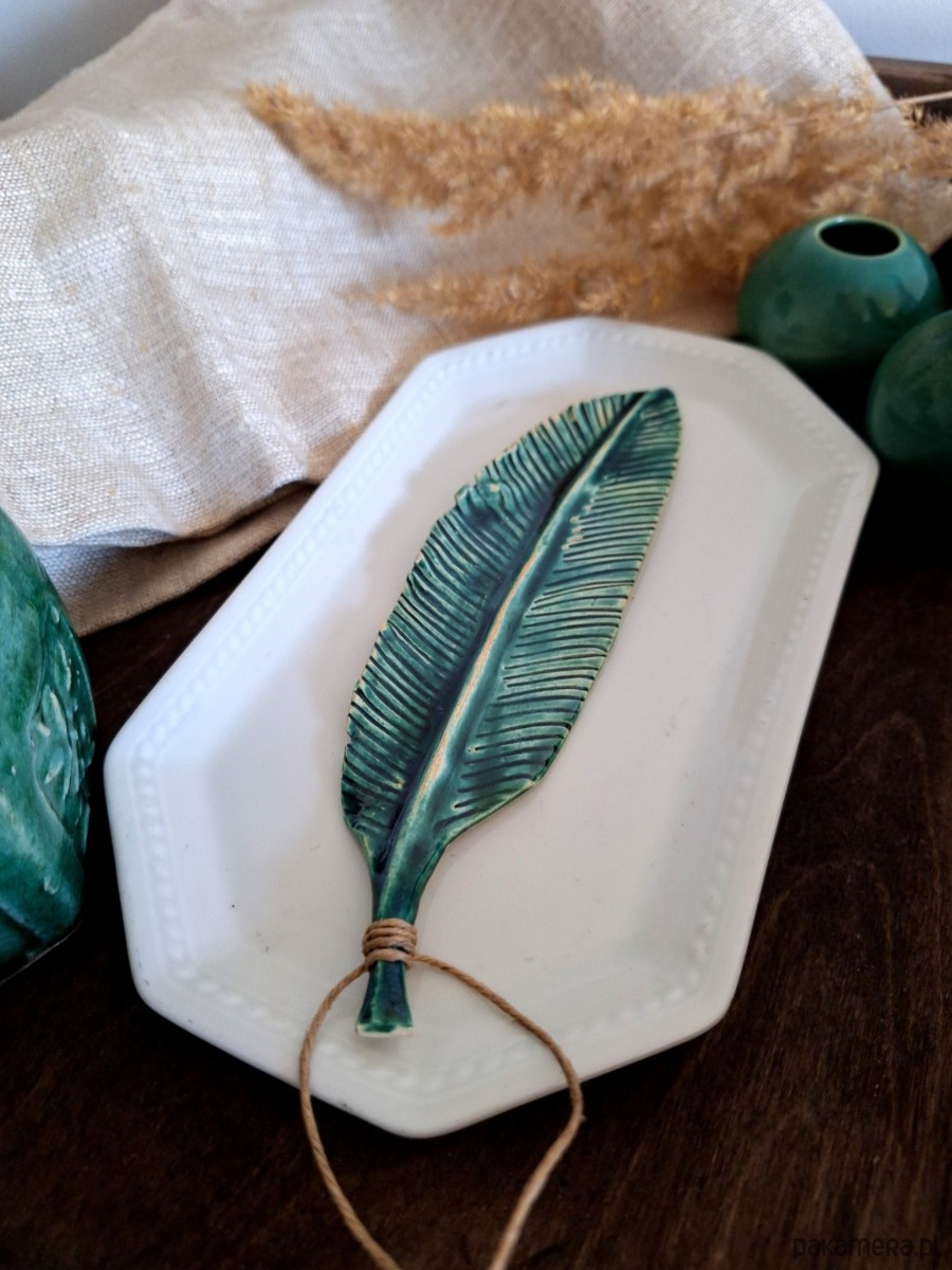 Ceramiczne pióro dekoracyjne, ręcznie formowane i szkliwione w szmaragdowym kolorze błyszczącym z miejscowymi jasnymi prześwitami. Dekorację można powiesić - dołączony sznureczek. Wyjątkowa i nietuzinkowa ozdoba dla zwolenników drobnej ceramiki dekoracyjnej oraz miłośnika ptaków.