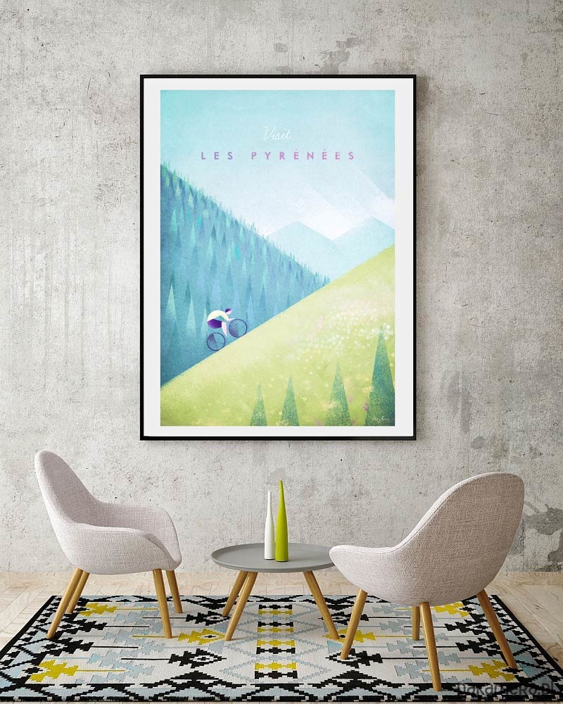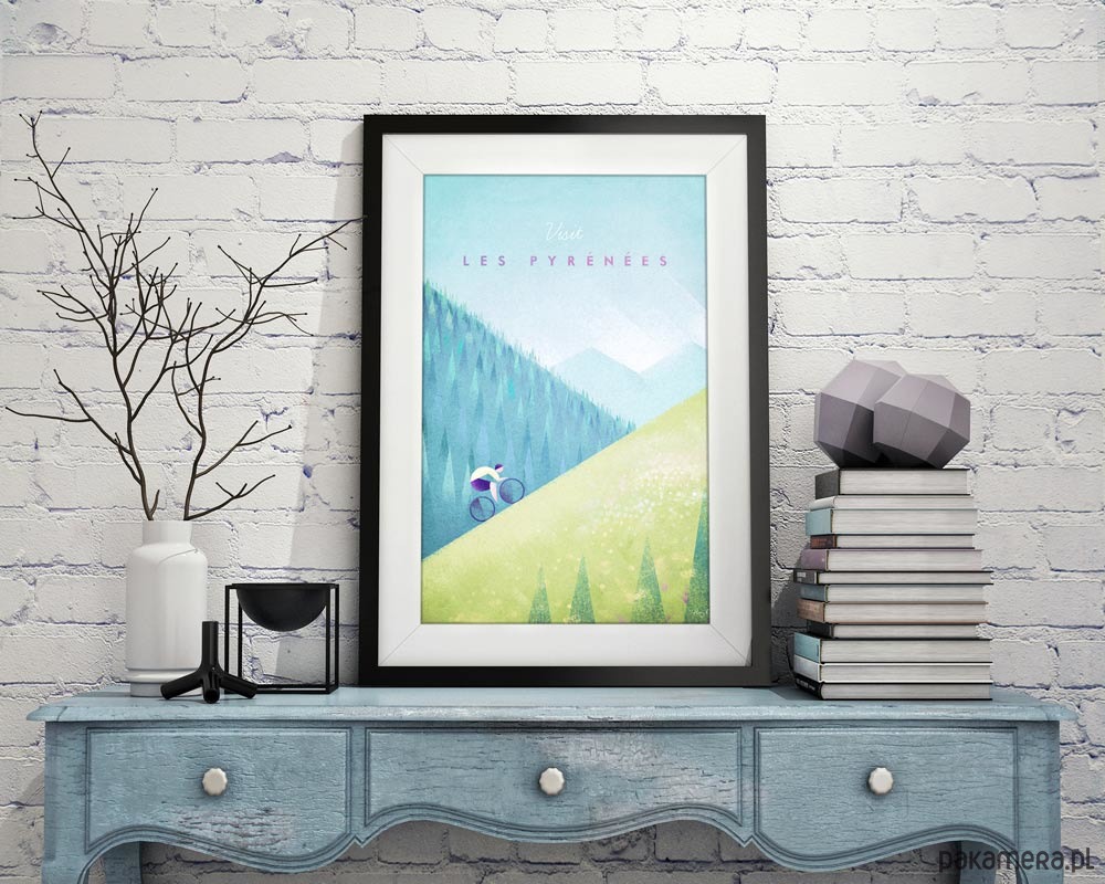 Plakat w stylu vintage przedstawiający kolarza pokonującego jeden z najbardziej wyczerpujących fragmentów Tour de France. Na pierwszym planie rozpościera się łąka pokryta dzikimi kwiatami. W tle widoczne są gęsto zalesione stoki Pirenejów. Inspirowany plakatami podróżniczymi z lat 20-tych XX wieku.