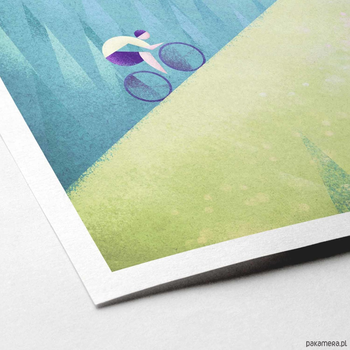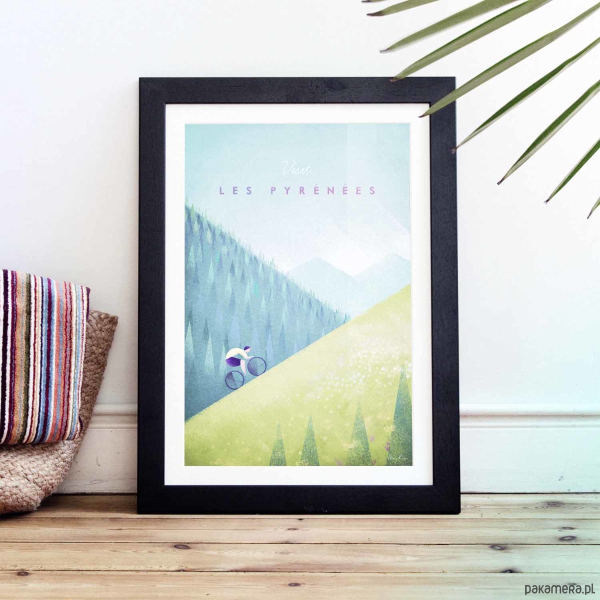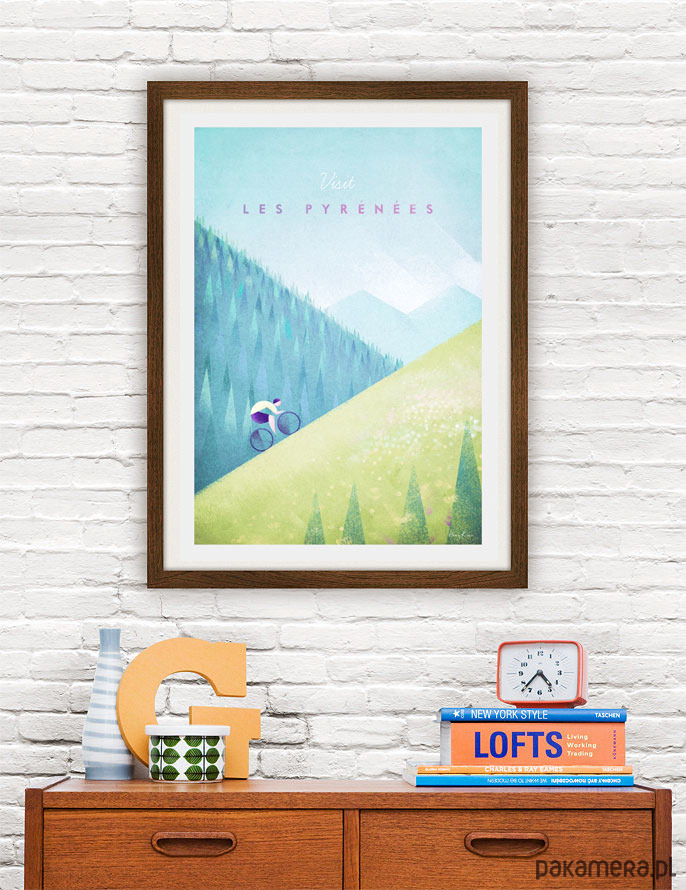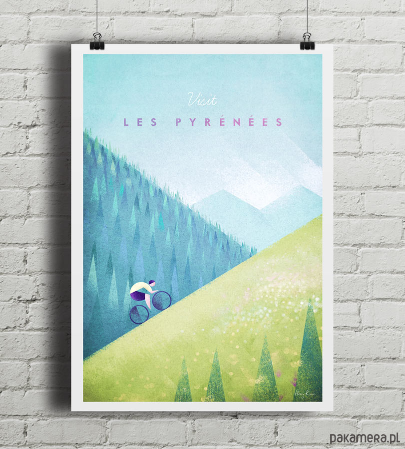 Plakat w stylu vintage przedstawiający kolarza pokonującego jeden z najbardziej wyczerpujących fragmentów Tour de France. Na pierwszym planie rozpościera się łąka pokryta dzikimi kwiatami. W tle widoczne są gęsto zalesione stoki Pirenejów. Inspirowany plakatami podróżniczymi z lat 20-tych XX wieku.