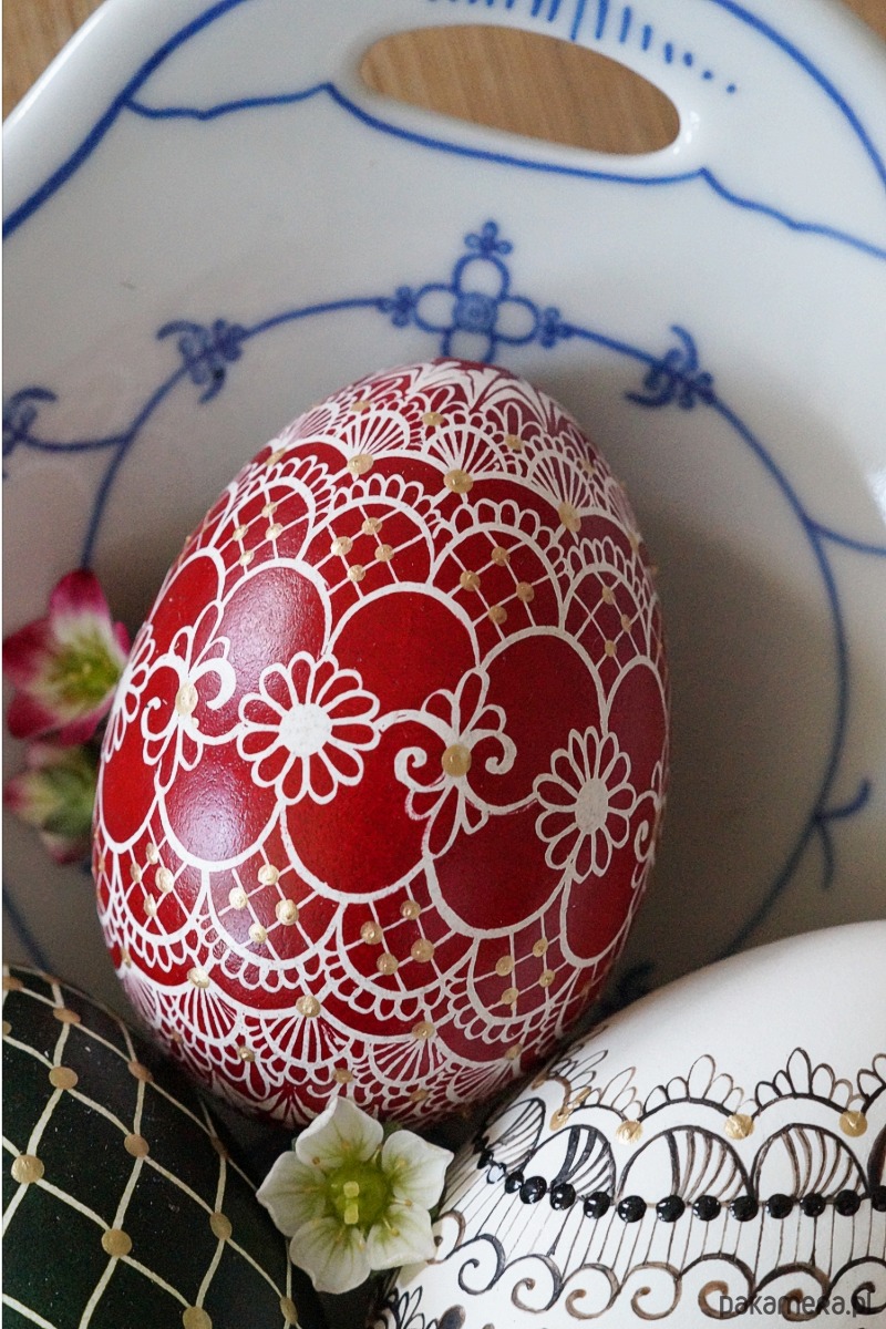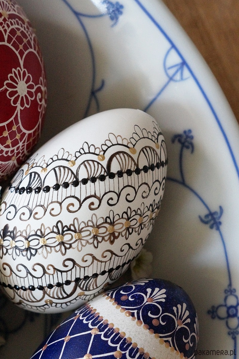 Tradycyjna pisanka batikowa malowana ręcznie na wydmuszce jaja gęsiego.