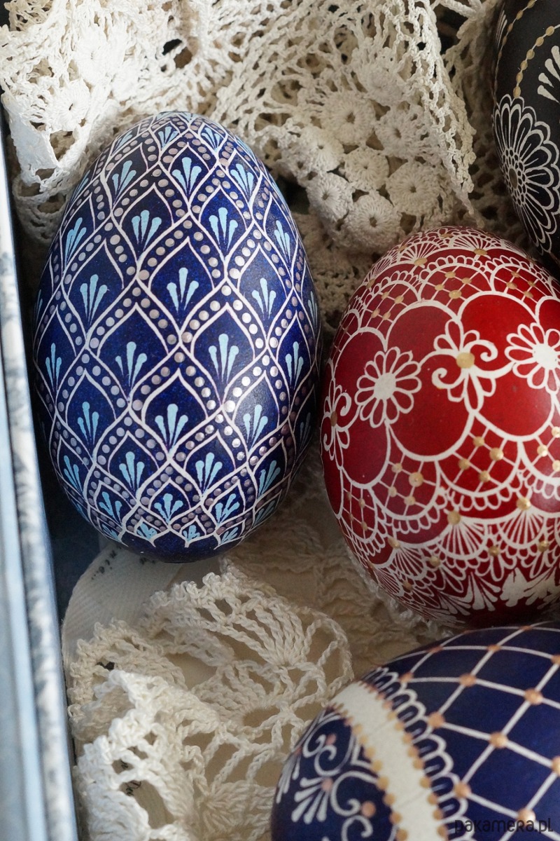 Tradycyjna pisanka batikowa malowana ręcznie na wydmuszce jaja gęsiego.