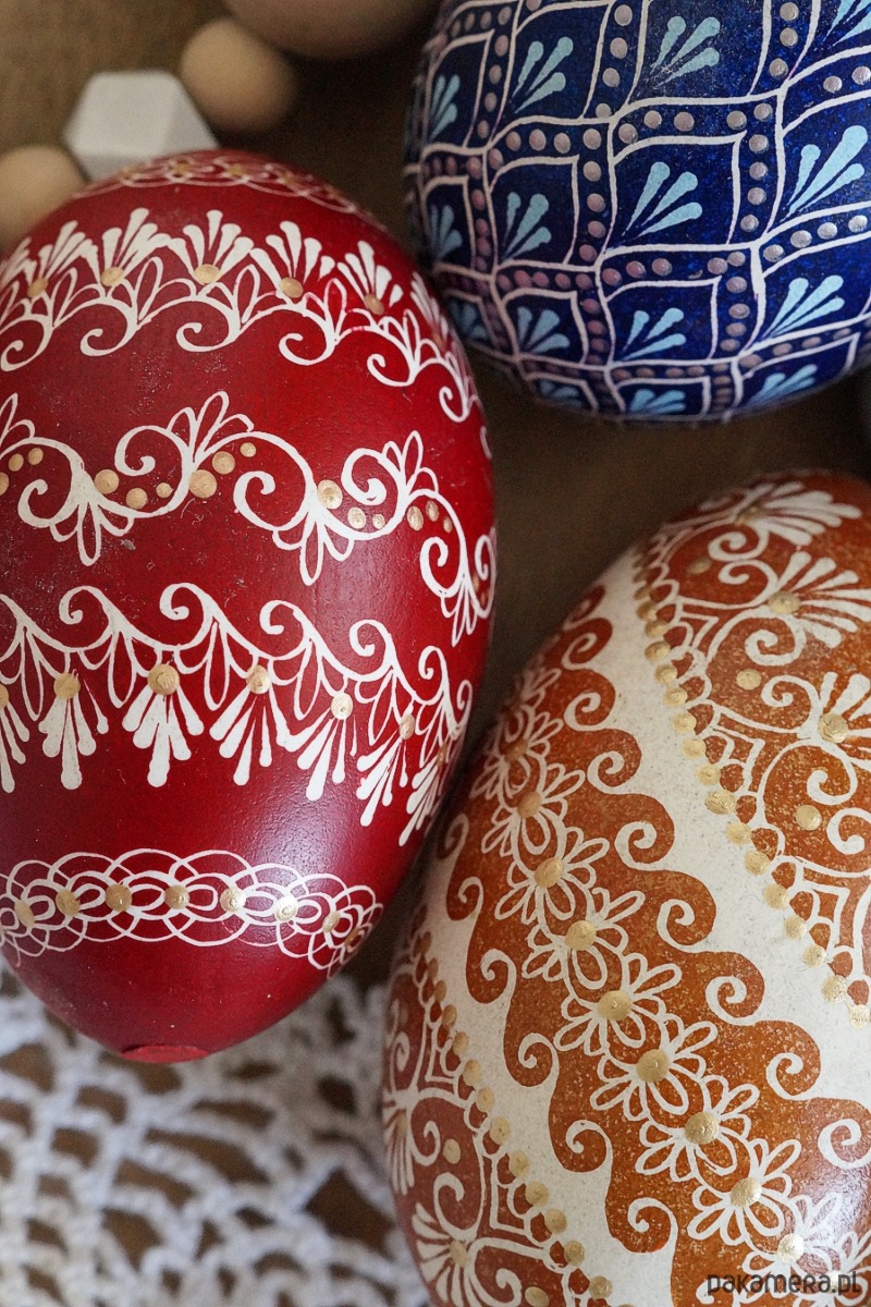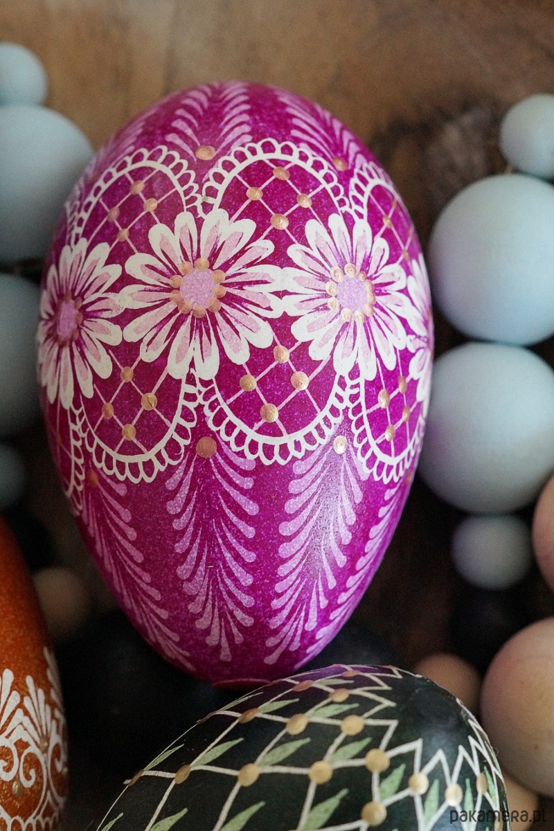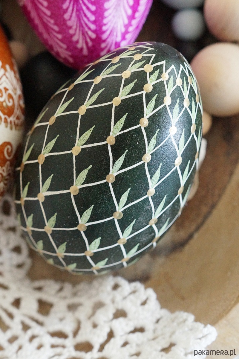Tradycyjna pisanka batikowa malowana ręcznie na wydmuszce jaja gęsiego.