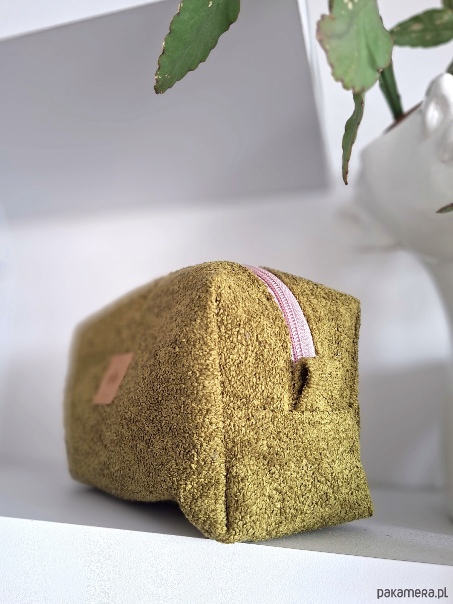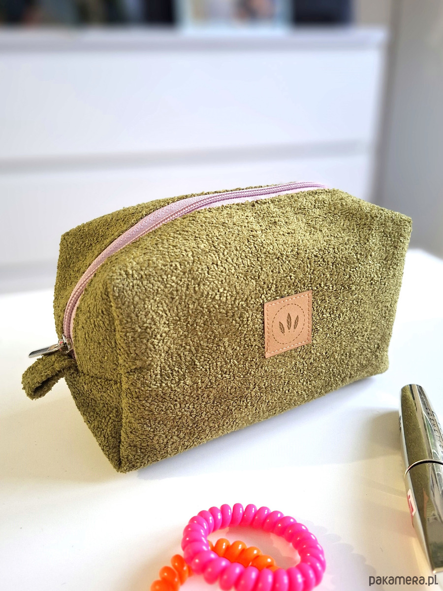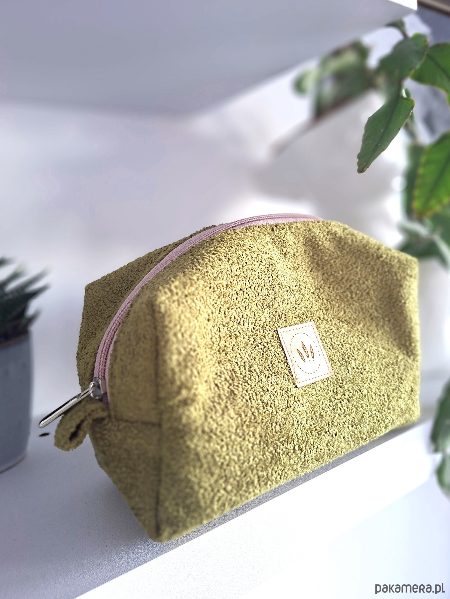 Pistacjowa kosmetyczka frotte z różowym zamkiem