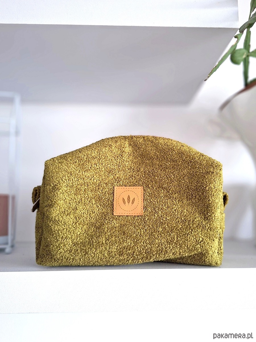 Średniej wielkości kosmetyczka z fantazyjnej tkaniny typu baranek.