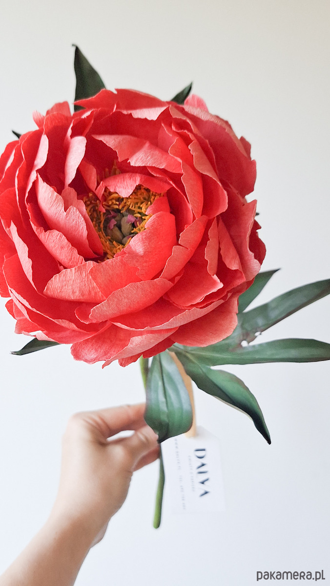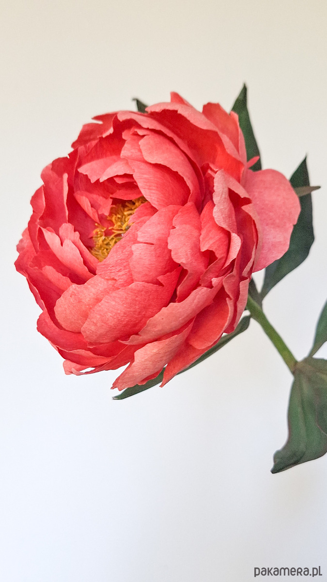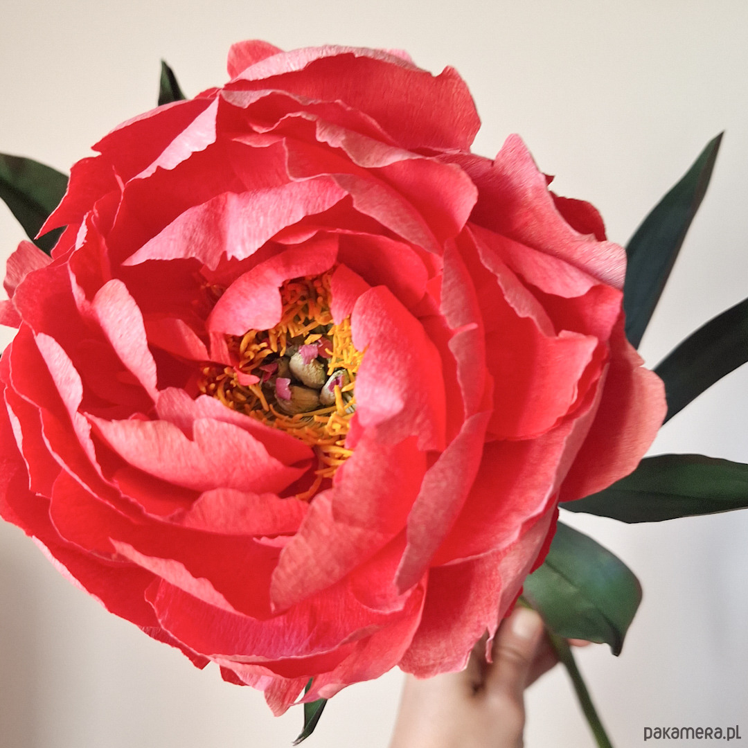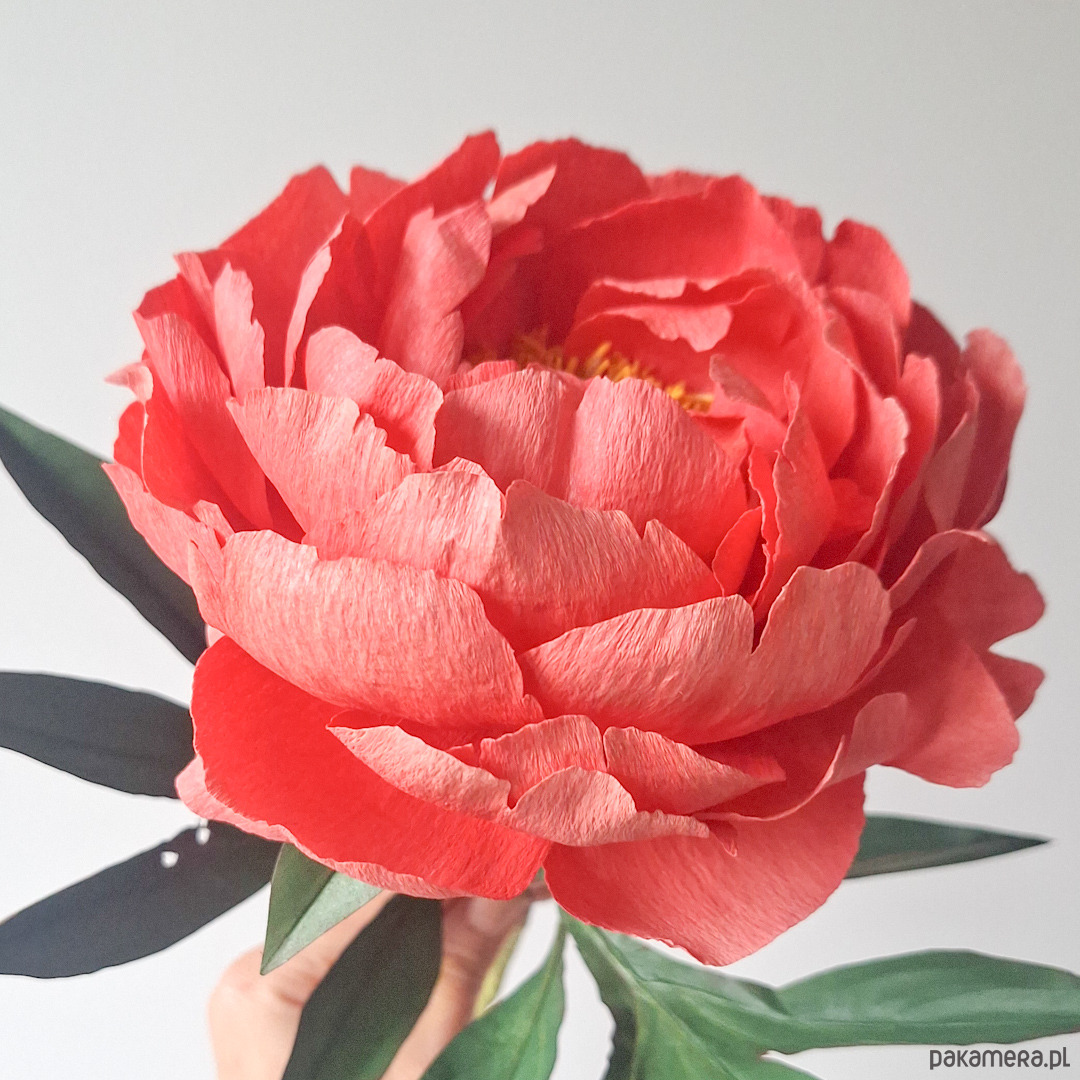 Na zamówienie chętnie wykonam z papieru piwonię w kolrorze koralowym, która zachwyca swoimi żółtymi pręcikami i pięknymi dużymi płatkami w ciepłych odcienaich różu i pomarańczy. Całośc wykonana jest ze świetnych jakościowo papierów, głównie krepiny. Wszystkie elementy piwonii sa ręćznie farbowane, cięte, klejone i formowane. Użyte materiały są bezpieczne i w pełni ekologiczne i co ważne odporne na promieniowanie UV.